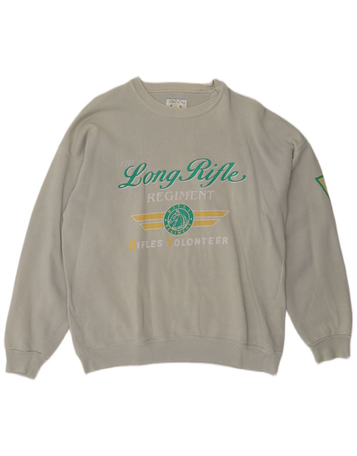 - Descrizione dell'IA: Questa felpa da uomo Rifle è realizzata in morbido pile misto cotone grigio, che offre calore e comfort. Presenta un classico girocollo e maniche lunghe. La vestibilità regolare assicura una silhouette comoda. Un logo prominente per il Long Rifle Regiment adorna la parte anteriore. Un ulteriore dettaglio logo è presente sulla manica. Questo modello di maglione è ideale per l'abbigliamento casual.