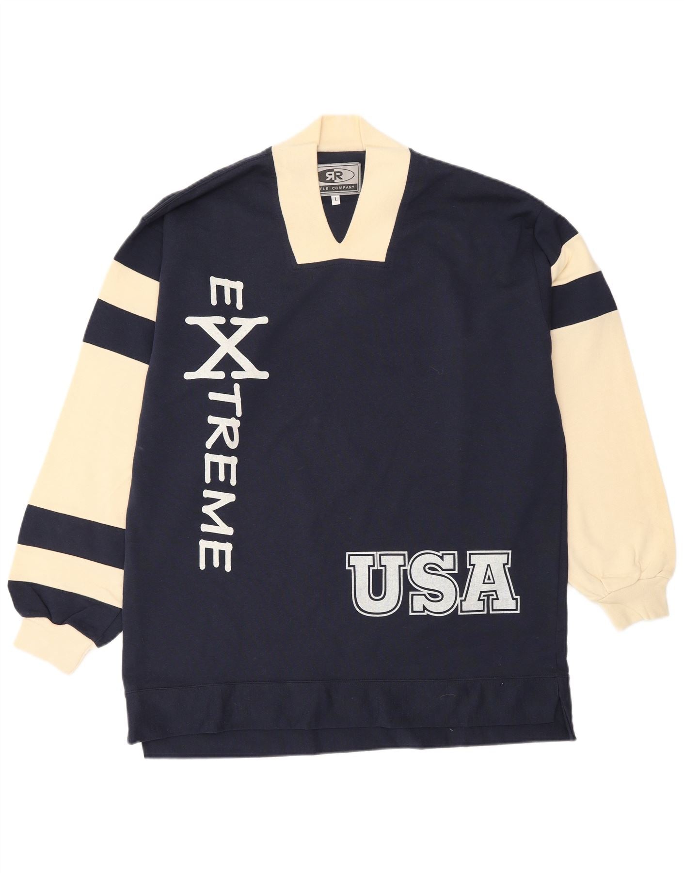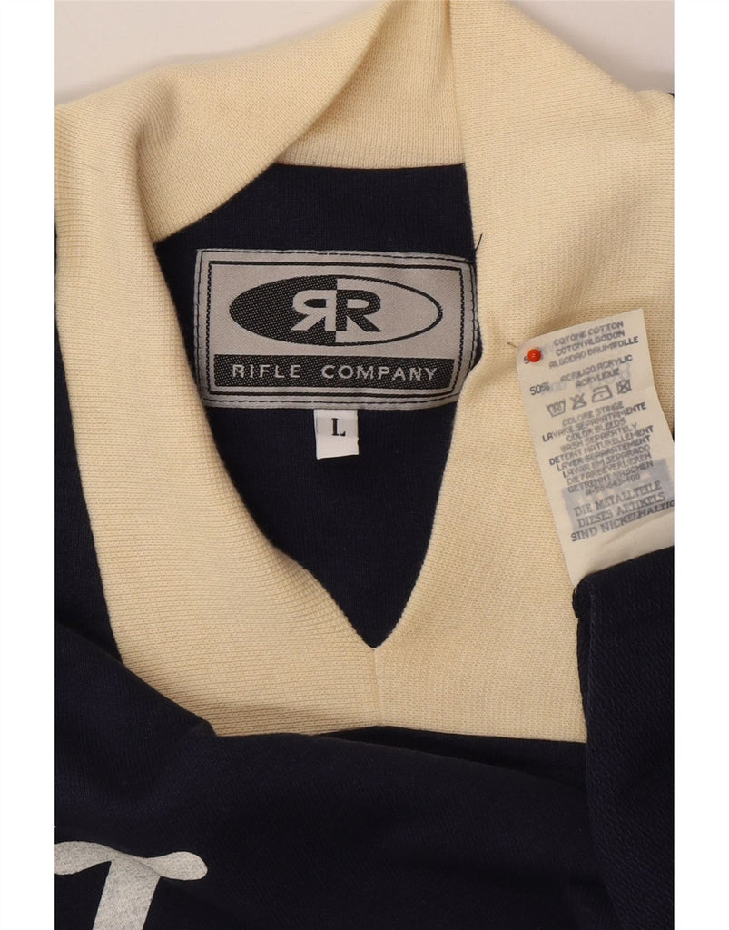 RIFLE Mens Graphic Sweatshirt Jumper Large Navy Blue Colourblock Cotton