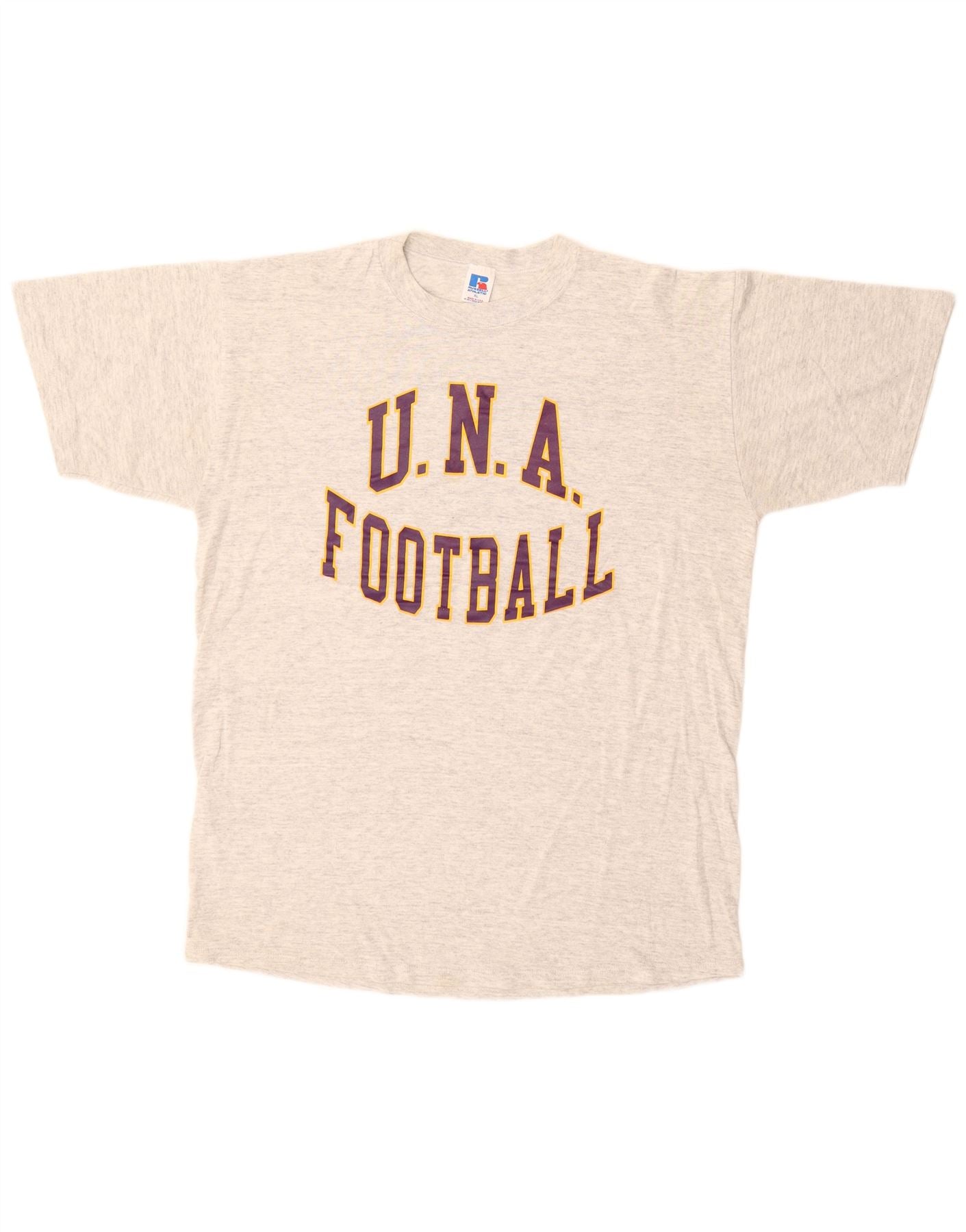 - Descrizione dell'IA: Questa maglietta grafica da uomo Russell Athletic è realizzata in morbido tessuto a maglia grigio, che offre una sensazione confortevole. Presenta un classico girocollo e maniche corte. La vestibilità regolare garantisce facilità di movimento. Un coraggioso U.N.A. La stampa grafica FOOTBALL adorna la parte anteriore, aggiungendo uno stile sportivo universitario distintivo. Questo modello di maglione è perfetto per l'abbigliamento casual.