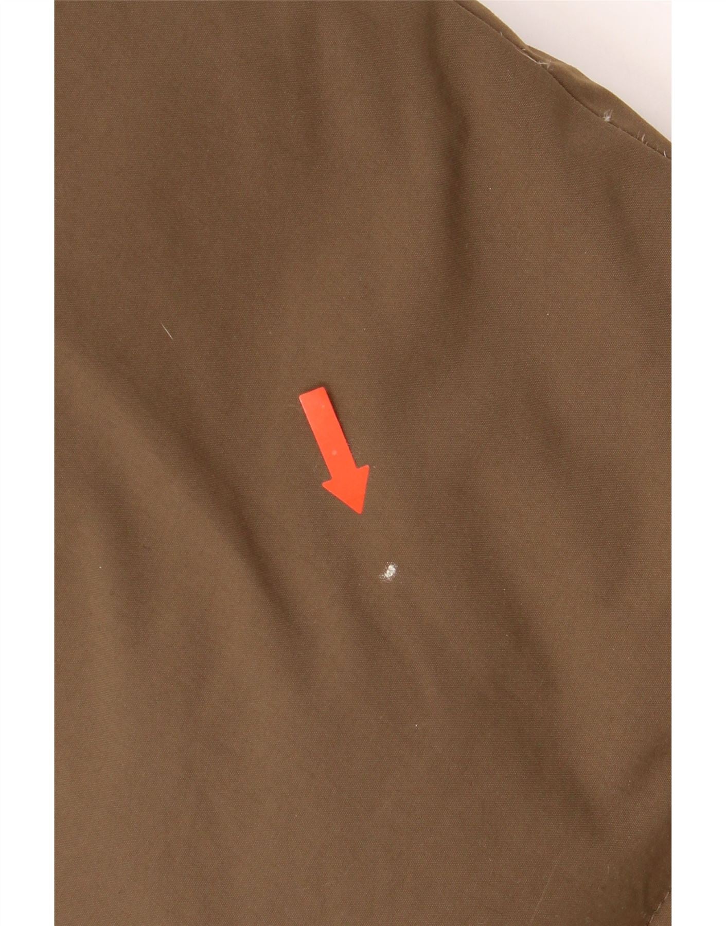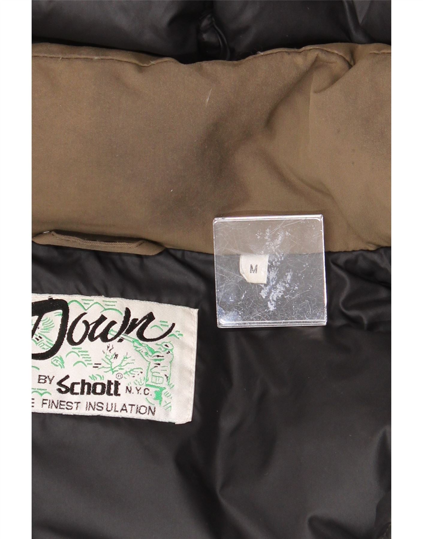 - AI Description: This pre-owned Schott padded jacket is perfect for winter. Constructed from durable polyester with a down fabric type, it features a regular fit, zip closure, and a practical hood with fur trim. The brown jacket includes zipped pockets for added convenience and is water-resistant. While in fair condition, it exhibits minor stains on the front, pocket, and back. Size M.