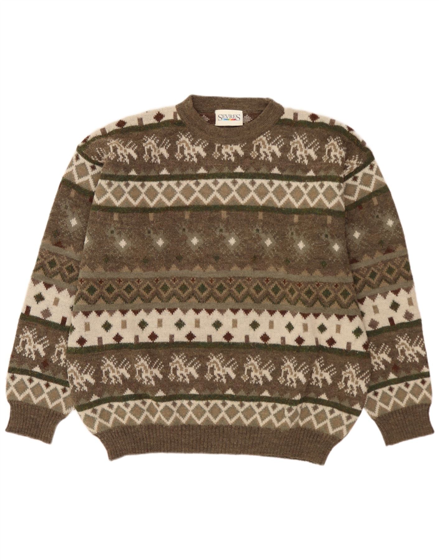 SEVRES Maglione girocollo da uomo IT 52 Large Lana Fair Isle color kaki