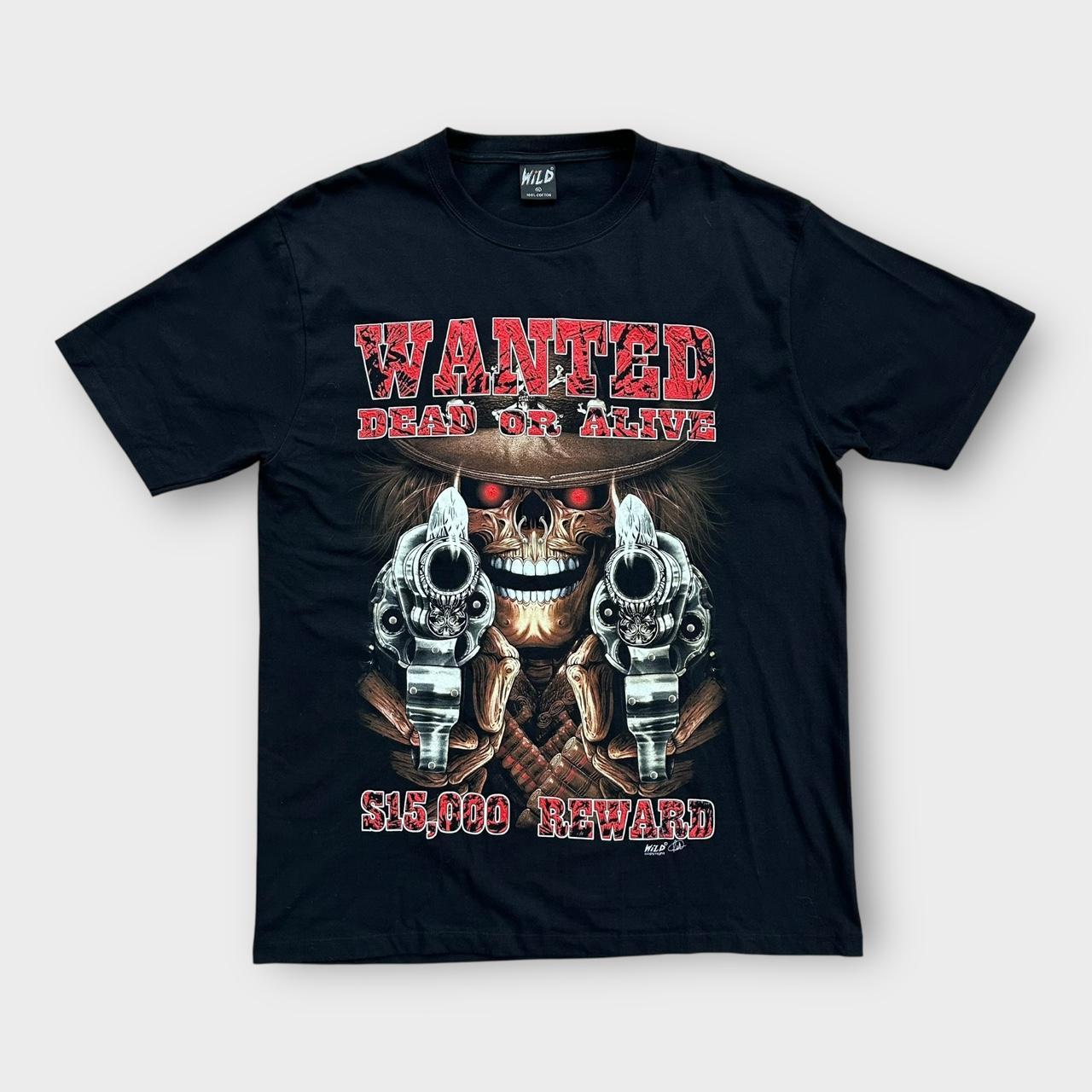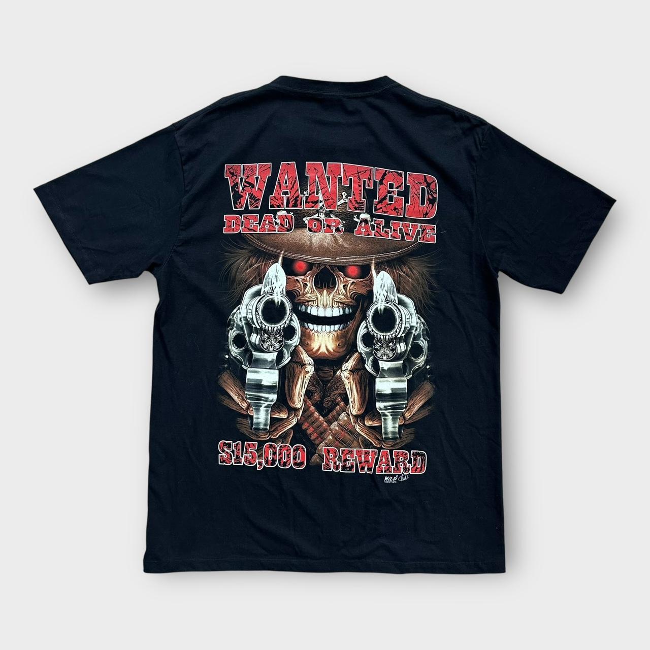 T-shirt con grafica con teschio dei primi anni 2000 "Wanted dead or Alive" con stampa sul petto e sul retro su un'etichetta selvaggia. Presenta anche dettagli in metallo sul davanti
