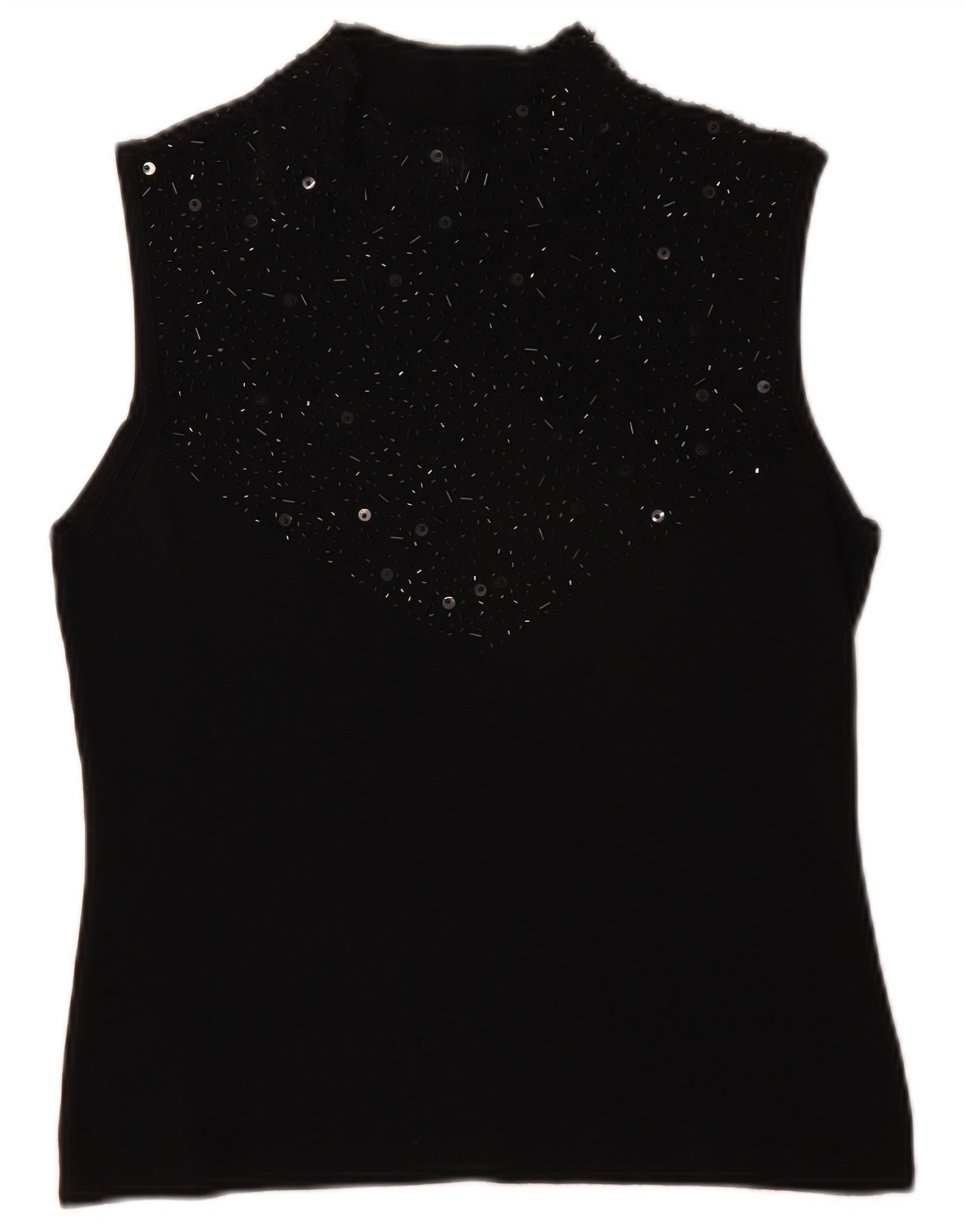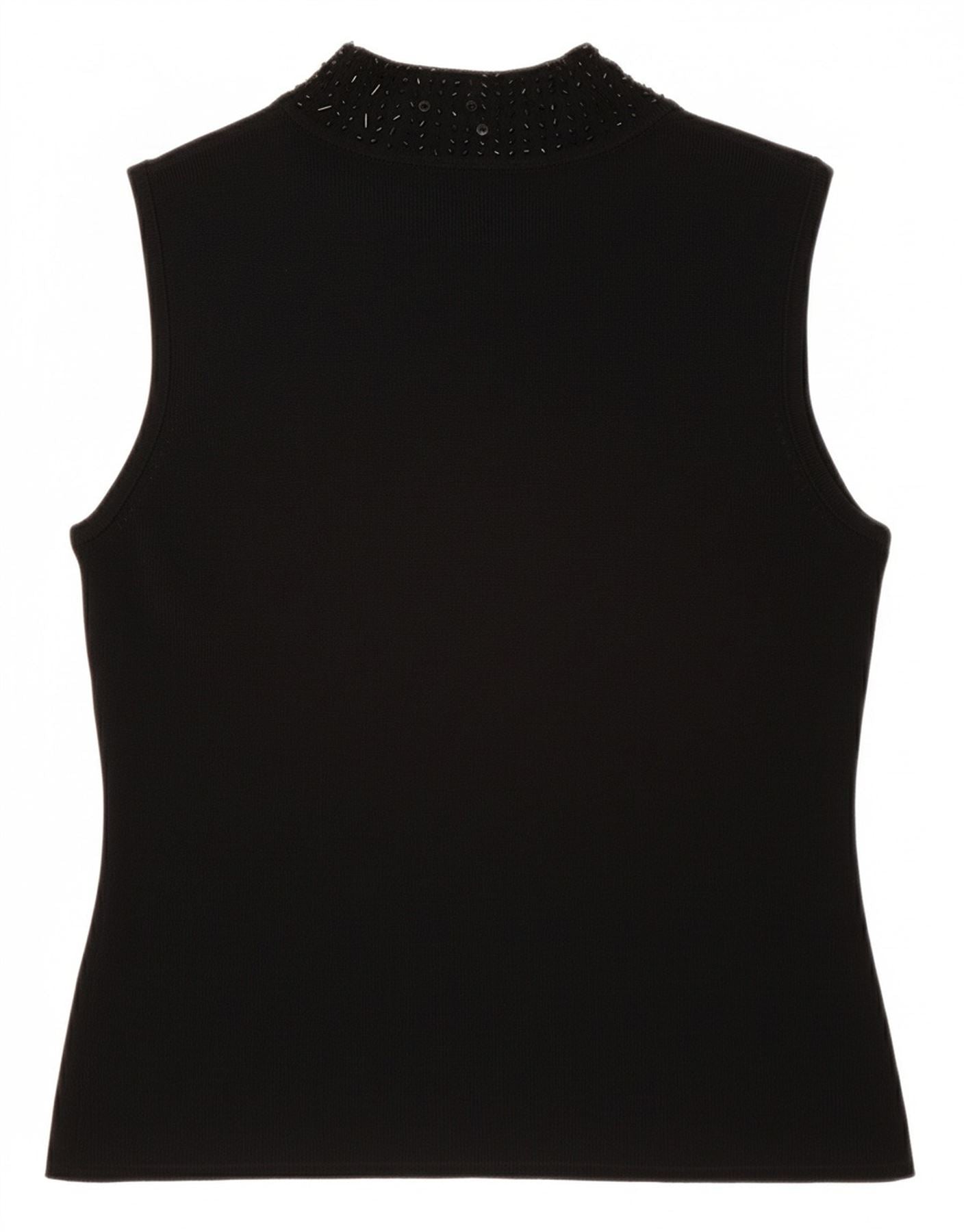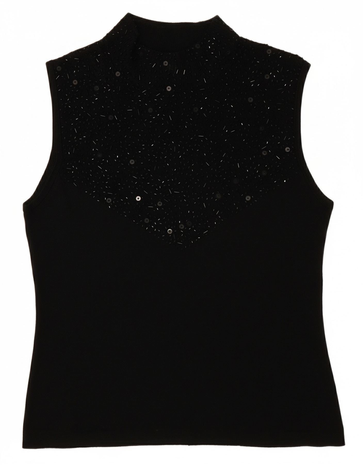 - Descrizione dell'IA: Questa canotta da donna Sky Designs è realizzata in una morbida miscela di rayon, che offre una sensazione liscia e confortevole. Presenta un sofisticato collo a lupetto e un design senza maniche. Lo stile pullover garantisce un look pulito e aerodinamico. Una vestibilità regolare offre un'usura confortevole. Un motivo astratto valorizza sottilmente il tessuto nero. Delicati accenti di perline aggiungono un tocco di elegante abbellimento.
