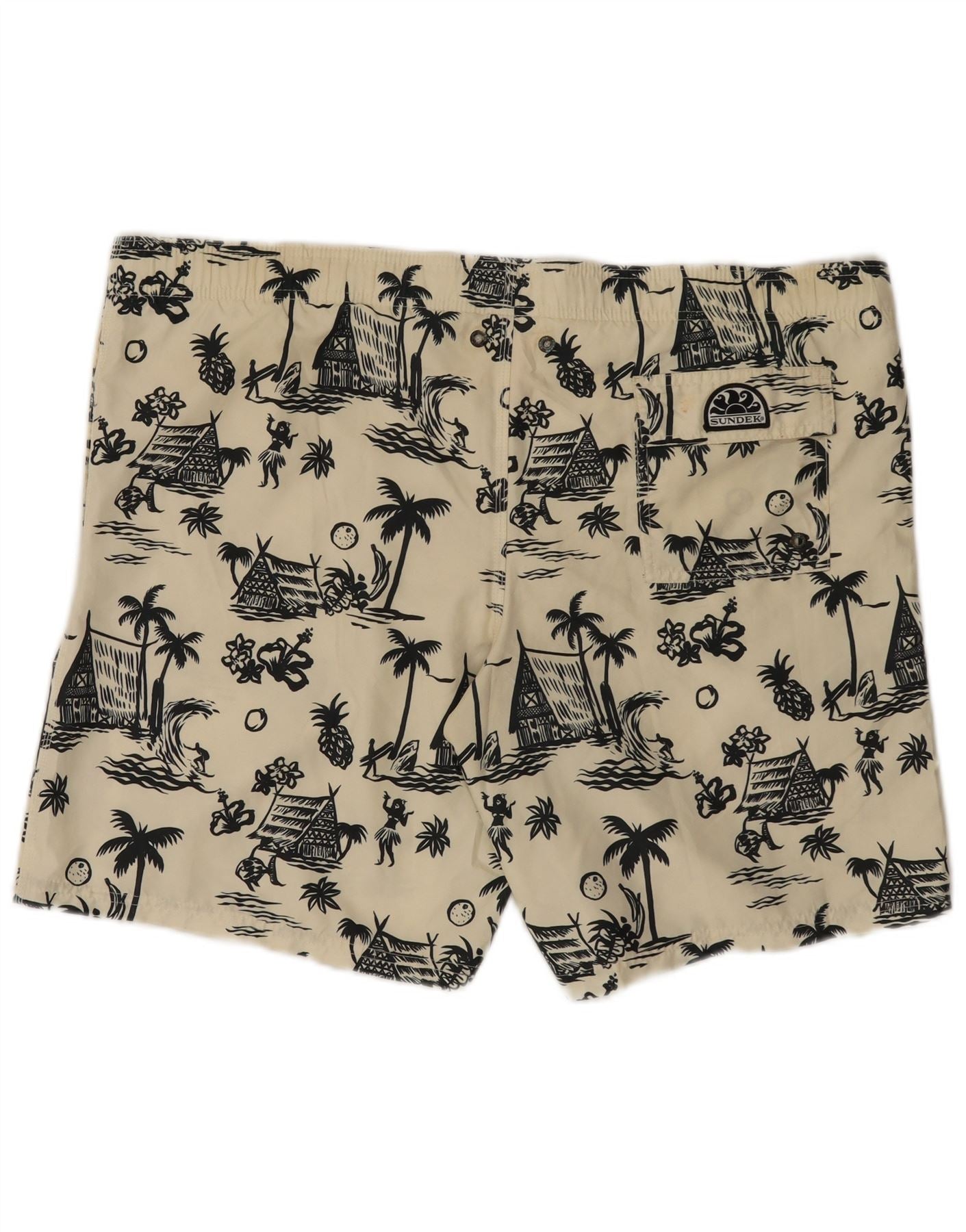 - Descrizione dell'IA: Questi pantaloncini da bagno da uomo Sundek sono realizzati in tessuto leggero 100% poliestere. Presentano una base bianco sporco con una sorprendente stampa hawaiana nera. La vestibilità regolare e la vita elasticizzata garantiscono comfort. La chiusura con coulisse offre una vestibilità regolabile. Sono incluse pratiche tasche. Un sottile logo Sundek aggiunge un tocco di marca.