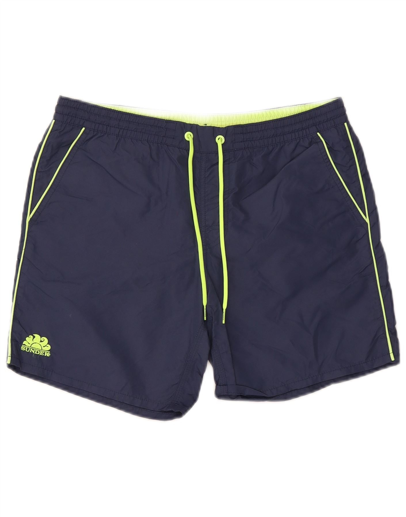 - Descrizione dell'IA: Questi pantaloncini da bagno da uomo Sundek sono realizzati in tessuto 100% poliestere in una tonalità blu navy. Sono caratterizzati da una comoda vita elasticizzata con chiusura a coulisse per una vestibilità regolabile. I dettagli dei bordini giallo neon e il logo coordinato aggiungono un contrasto vivace. La vestibilità regolare e l'interno foderato assicurano comfort e praticità per il nuoto. Le tasche laterali offrono un comodo spazio per riporre gli oggetti.