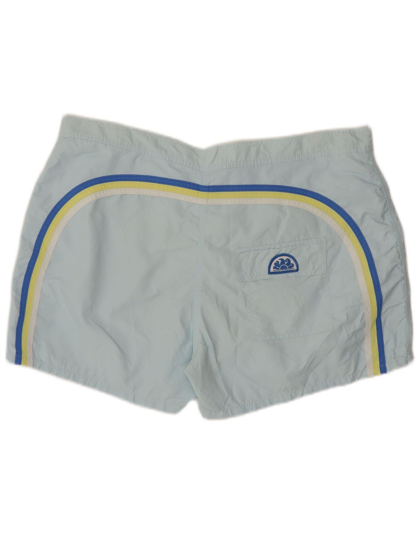 - Descrizione dell'IA: Questi pantaloncini da bagno da uomo Sundek sono realizzati al 100% in nylon, offrendo una finitura leggera e resistente all'acqua. Il colore blu turchese è completato da un motivo a blocchi di colore con strisce gialle e blu sul retro. La vita elasticizzata con chiusura a coulisse garantisce una vestibilità sicura e regolare. Include pratiche tasche e un discreto logo Sundek sul retro, perfetto per il nuoto e l'abbigliamento da spiaggia.