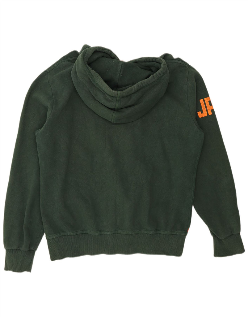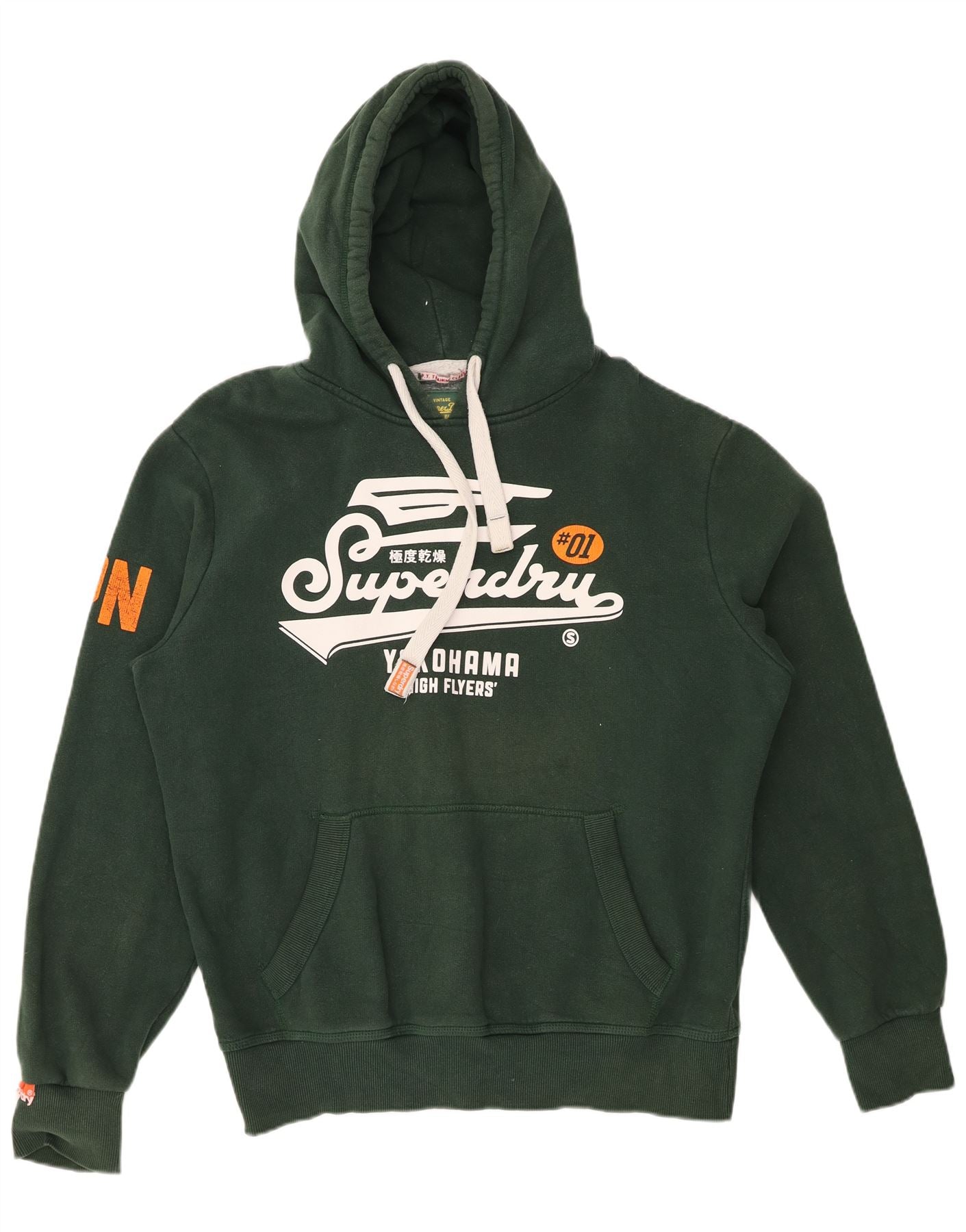 - AI Description: This Superdry mens hoodie jumper is crafted from a comfortable green cotton blend fabric. Its soft texture ensures warmth and ease. The hooded design features a drawstring for adjustable coverage. Long sleeves and a regular fit provide a classic silhouette. A prominent Yokohama High Flyers graphic and Superdry logo accent the front. Practical pockets add functionality to this retro style.