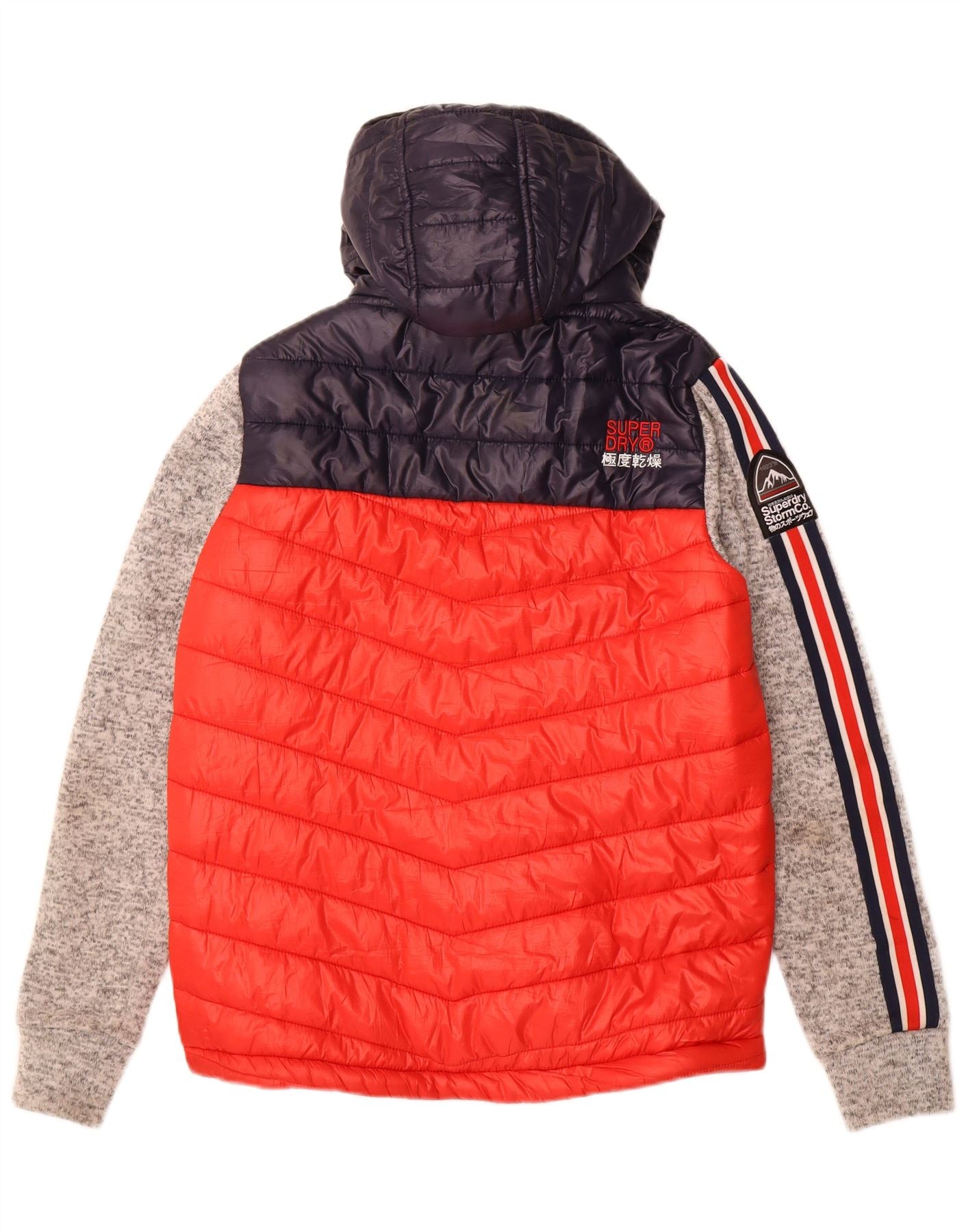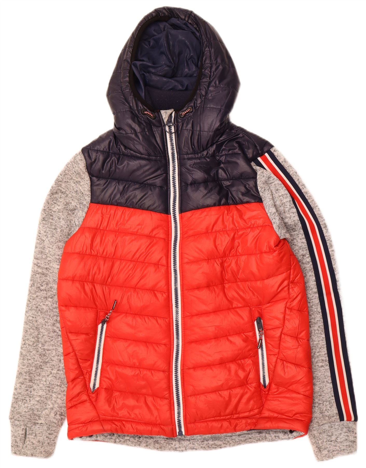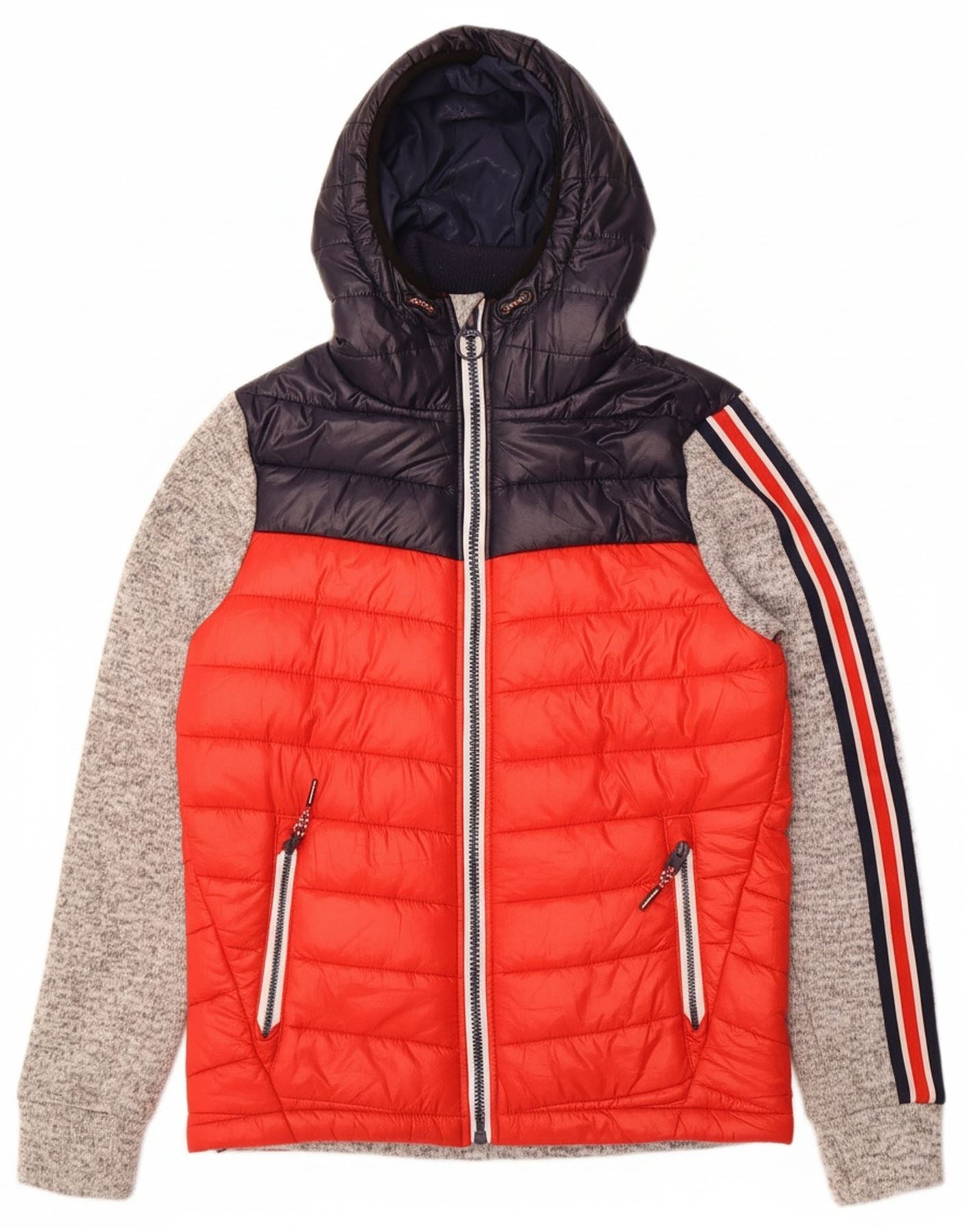 - AI Description: This Superdry mens padded jacket is crafted from durable polyester, offering a quilted texture. Its colourblock design combines red, navy blue, and grey panels for a dynamic look. A high neck and full zip closure provide warmth. It features a practical hood and long sleeves with ribbed cuffs. Multiple pockets add utility. The regular fit ensures comfortable wear, finished with a subtle logo accent.