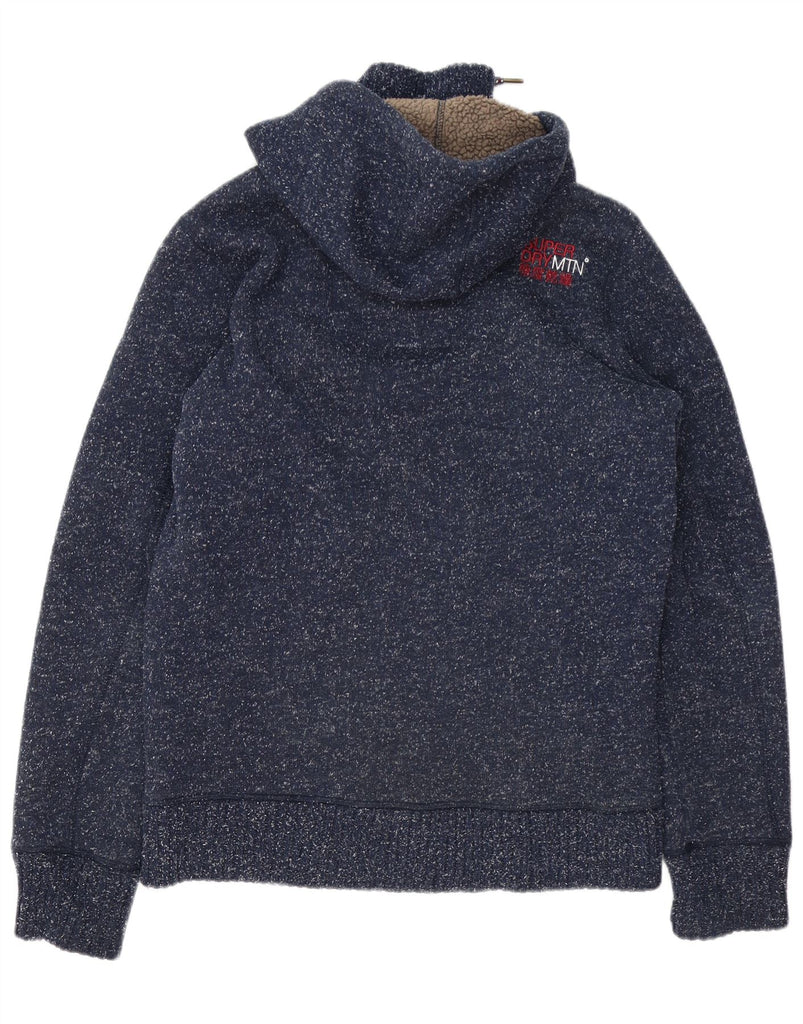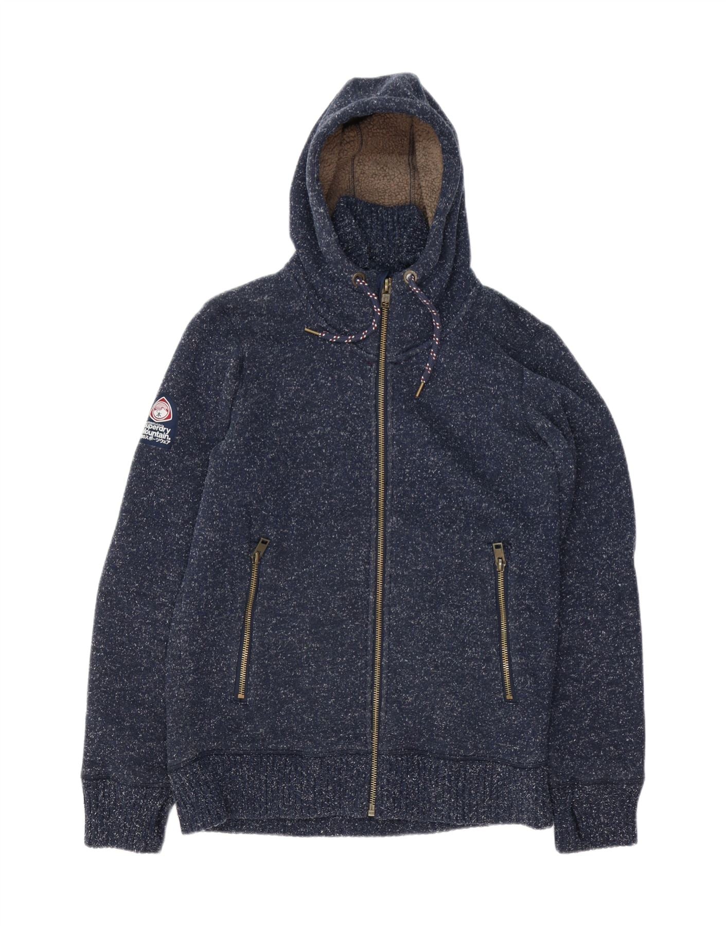 - AI Description: This Superdry mens zip hoodie sweater is crafted from a soft, blended acrylic, cotton, and polyester fabric, offering a comfortable Sherpa texture. Its navy blue hue provides a versatile look. The full zip closure extends to a high neck, complemented by a practical hood. Long sleeves and a regular fit ensure ease of wear. Zipped pockets and a subtle logo accent add functional and stylish details.