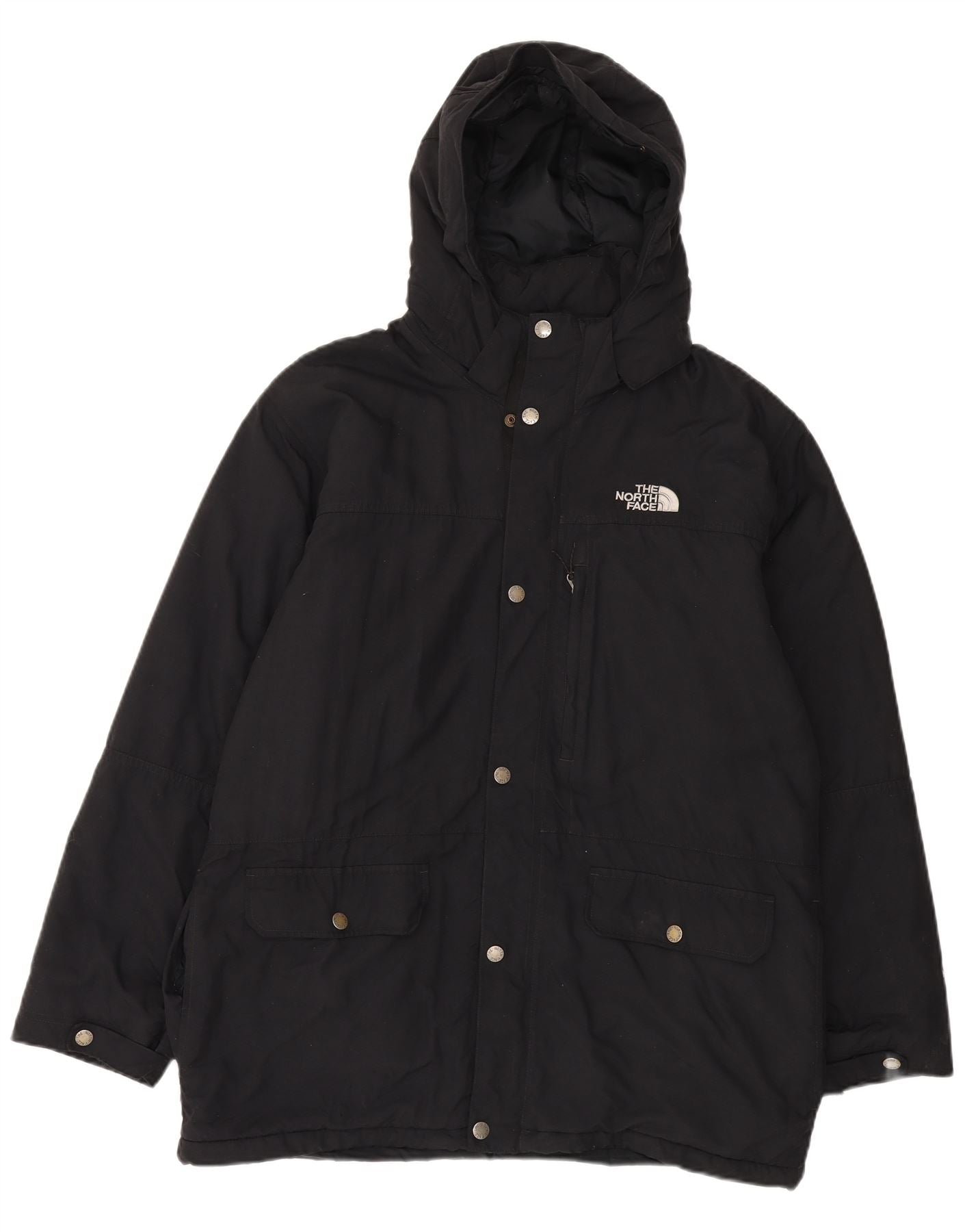 - Descrizione dell'IA: Questa giacca imbottita da uomo The North Face è realizzata in resistente tessuto nero, che offre protezione resistente all'acqua. Presenta un pratico design con cappuccio e una chiusura full zip, ulteriormente protetta da bottoni a pressione. Le maniche lunghe e lo scollo con colletto offrono un'ampia copertura. La vestibilità regolare garantisce comfort, mentre le tasche multiple e il discreto logo in risalto aggiungono dettagli funzionali e firmati.
