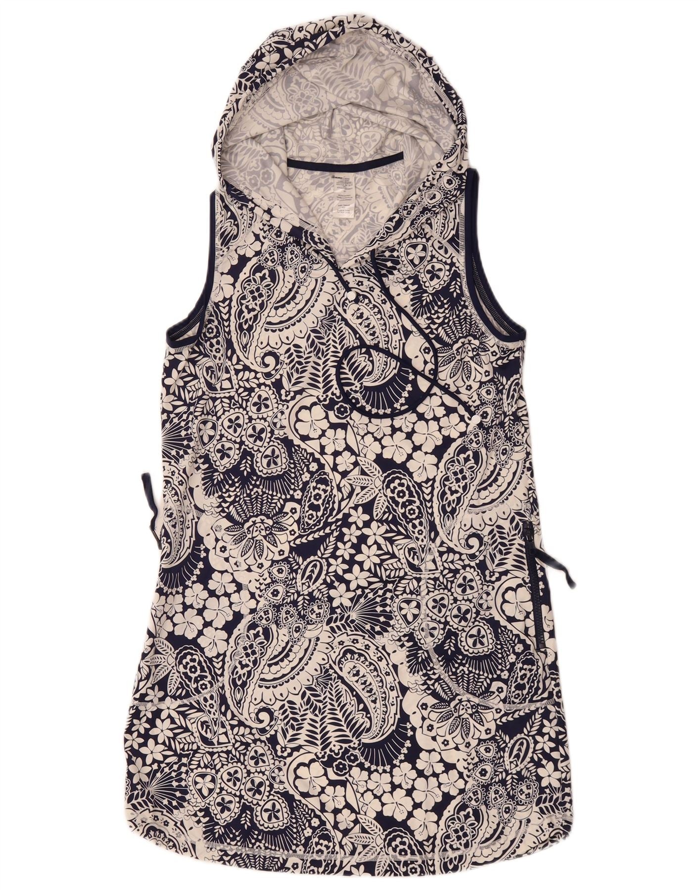 - Descrizione dell'IA: Questo abito con cappuccio da donna Tommy Bahama è realizzato in morbido jersey di poliestere. Presenta un vivace motivo paisley multicolore, prevalentemente blu navy e bianco. Il design senza maniche offre una vestibilità rilassata. Include un pratico cappuccio e comode tasche. Lo stile pullover assicura una facile indossabilità. Questo abito dalla vestibilità regolare incarna un'estetica bohémien.