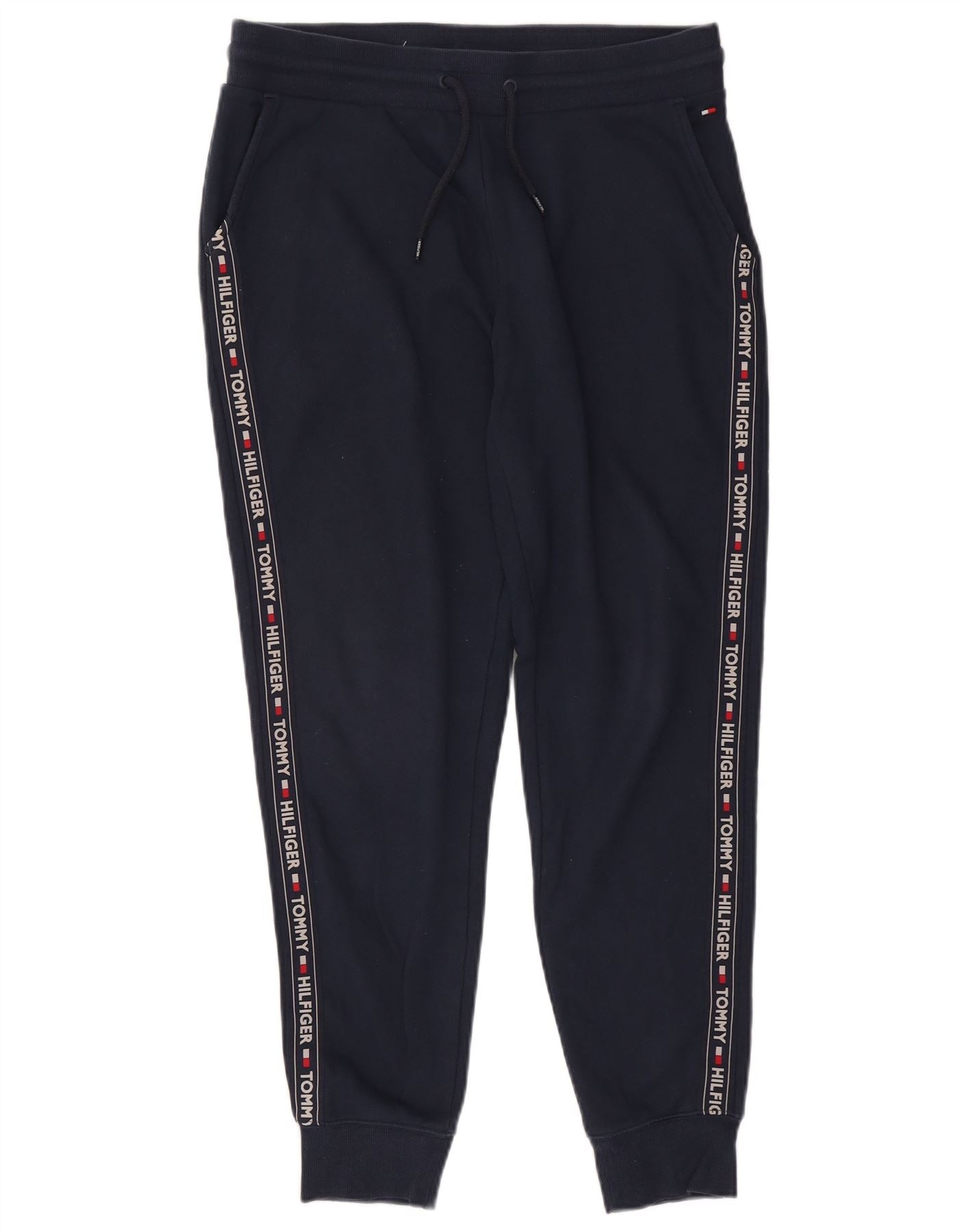 - Descrizione dell'IA: Questi pantaloni da jogging da tuta da uomo Tommy Hilfiger sono realizzati in un comodo tessuto misto blu navy, che offre una sensazione morbida. Presentano una vestibilità comoda con vita elastica e chiusura con coulisse per la regolazione. Le caviglie con risvolto forniscono una finitura ordinata. Le strisce laterali con loghi Tommy Hilfiger ripetuti aggiungono un motivo distintivo del marchio. Pratiche tasche completano il design, perfette per l'abbigliamento sportivo o casual.