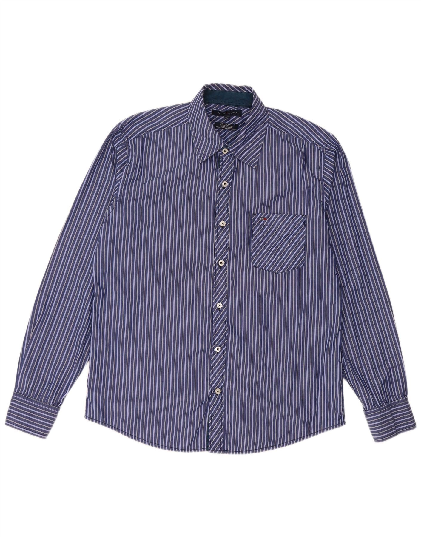 - Descrizione dell'IA: Questa camicia da uomo Tommy Hilfiger è realizzata in tessuto di cotone al 100%. Presenta un classico motivo a strisce blu per un look senza tempo. Lo scollo con colletto e la chiusura completa con bottoni offrono un fascino elegante e tradizionale. Maniche lunghe con dettaglio risvolto completano la struttura raffinata. Una singola tasca sul petto aggiunge uno stile pratico. Questa camicia dalla vestibilità classica garantisce un'usura confortevole.