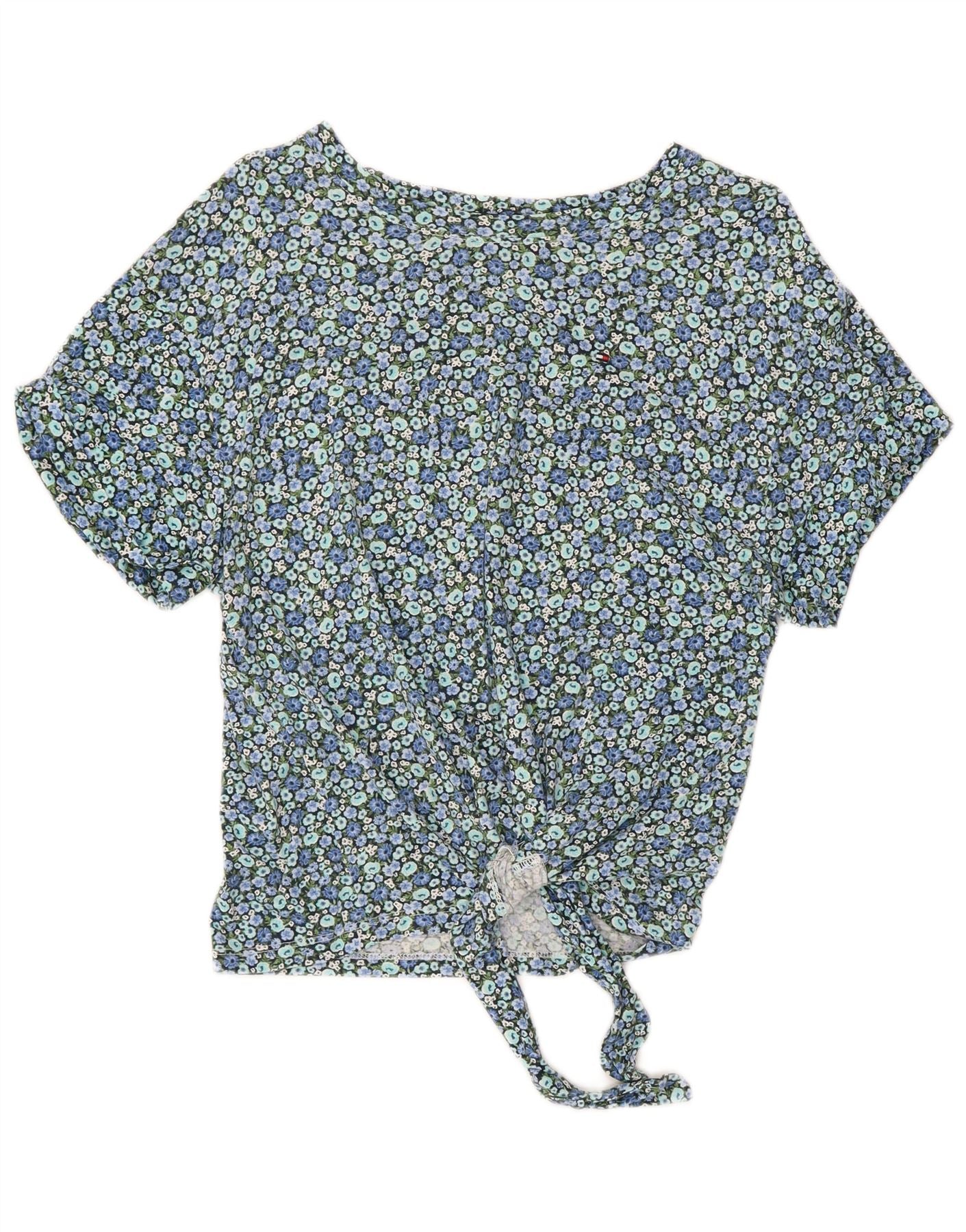 TOMMY HILFIGER Top corto da donna in camicetta UK 10 piccolo cotone floreale blu