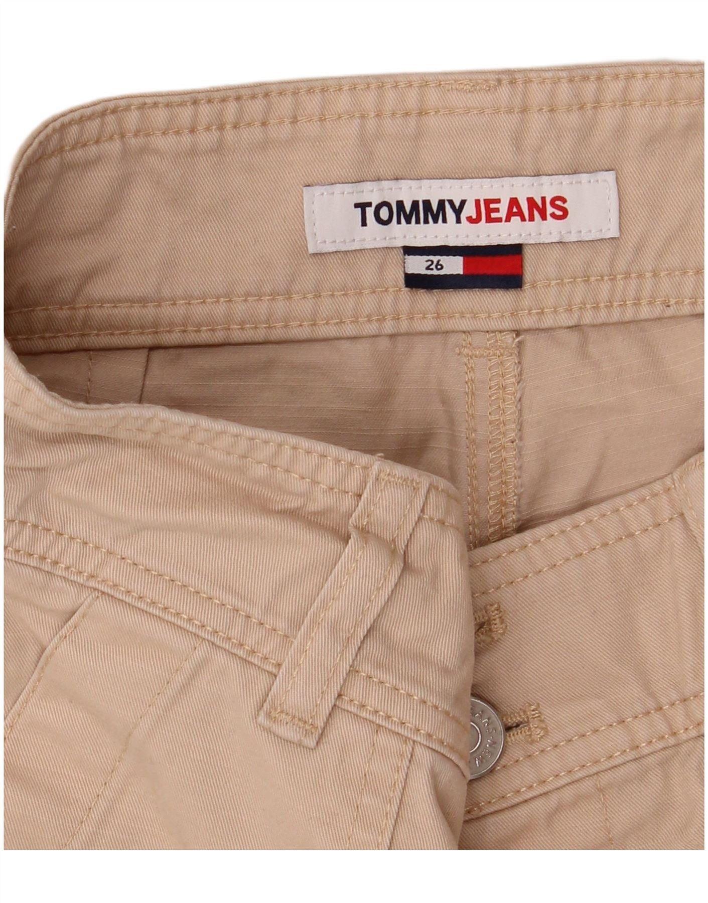 - Descrizione dell'IA: Questi pantaloncini chino da donna Tommy Jeans sono realizzati in resistente tessuto beige. Presentano una vestibilità regolare per un abbigliamento comodo. La chiusura con bottoni e la cintura forniscono una struttura classica. Pratiche tasche sono incluse nella parte anteriore e posteriore. I pulsanti tonali aggiungono un accento sottile e raffinato. Il design offre uno stile intramontabile e versatile adatto agli outfit casual di tutti i giorni.