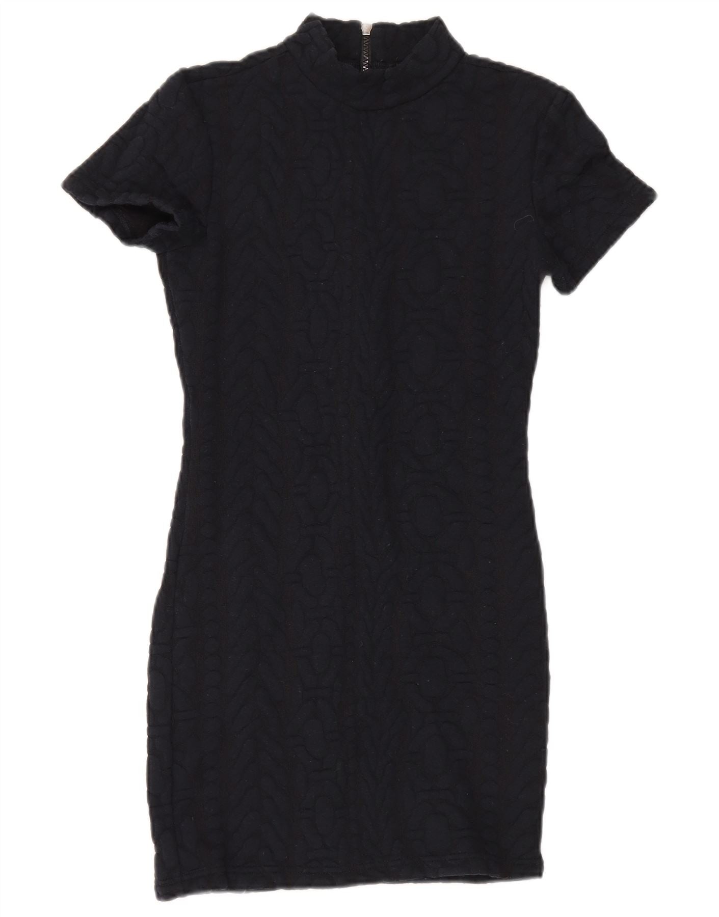 - Descrizione dell'IA: Questo abito aderente da donna Topshop è realizzato in un tessuto misto nero, caratterizzato da un sottile motivo geometrico. Presenta un elegante collo a lupetto con una pratica chiusura con zip sul davanti. Le maniche corte incorniciano perfettamente le spalle. La silhouette slim fit abbraccia la figura, creando un profilo elegante e moderno. Questo abito offre uno stile contemporaneo con un tocco raffinato.