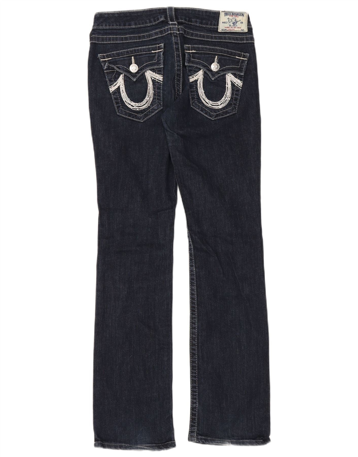 - AI Description: This True Religion women's straight jeans are crafted from classic navy blue denim. They feature a straight leg design for a timeless silhouette. The regular fit ensures comfortable wear. A button closure secures the mid-rise waist. Practical pockets are included, and a signature logo accent adds brand recognition. This classic style offers versatile appeal.