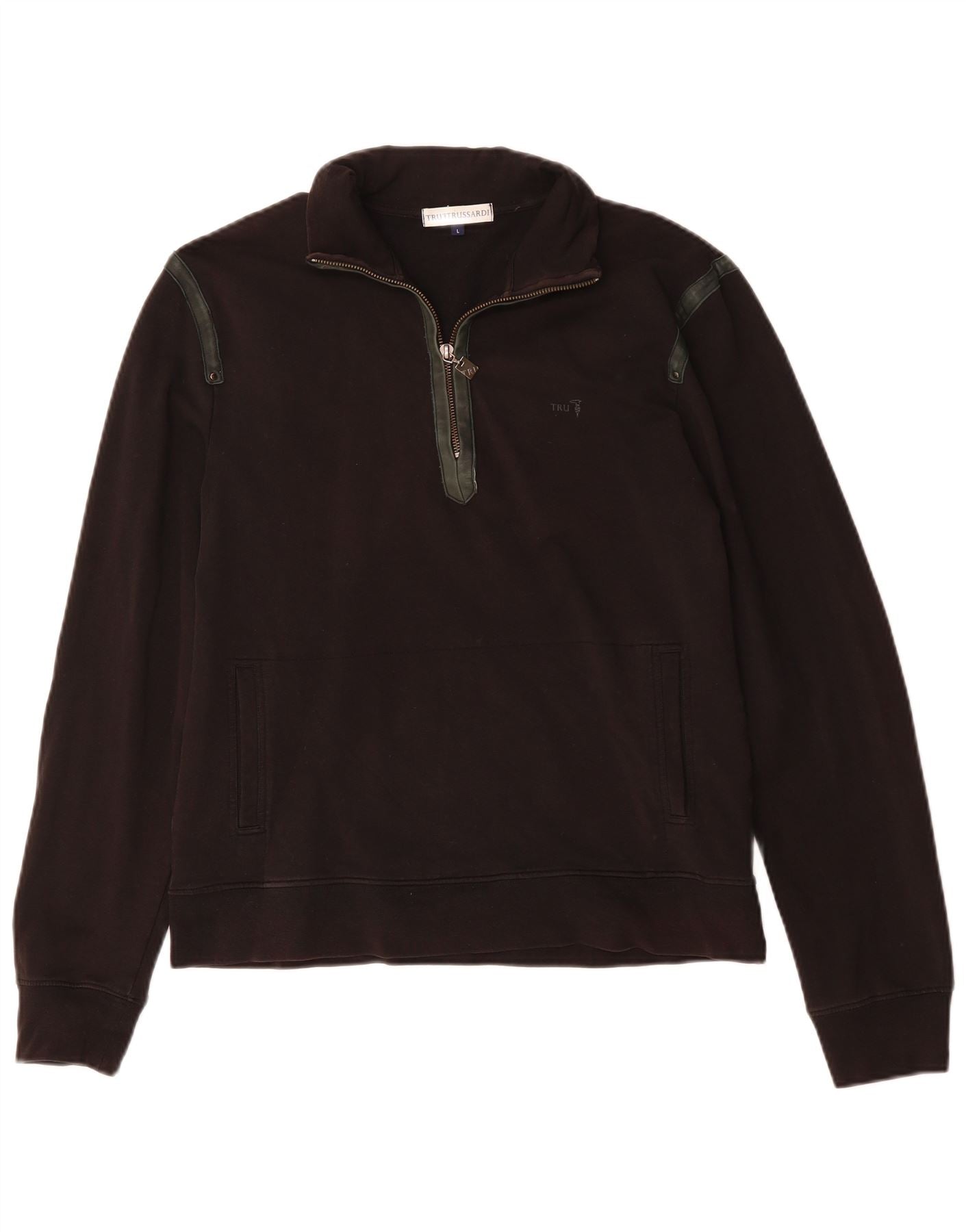 - Descrizione dell'IA: Questa felpa da donna Trussardi è realizzata in un comodo tessuto a maglia nera. Presenta uno scollo con colletto e una chiusura con zip a 1/4. Le maniche lunghe e la vestibilità regolare garantiscono comfort. I discreti dettagli del logo aggiungono un tocco distintivo. Pratiche tasche completano il design classico. Questo pezzo offre stile e versatilità senza tempo.