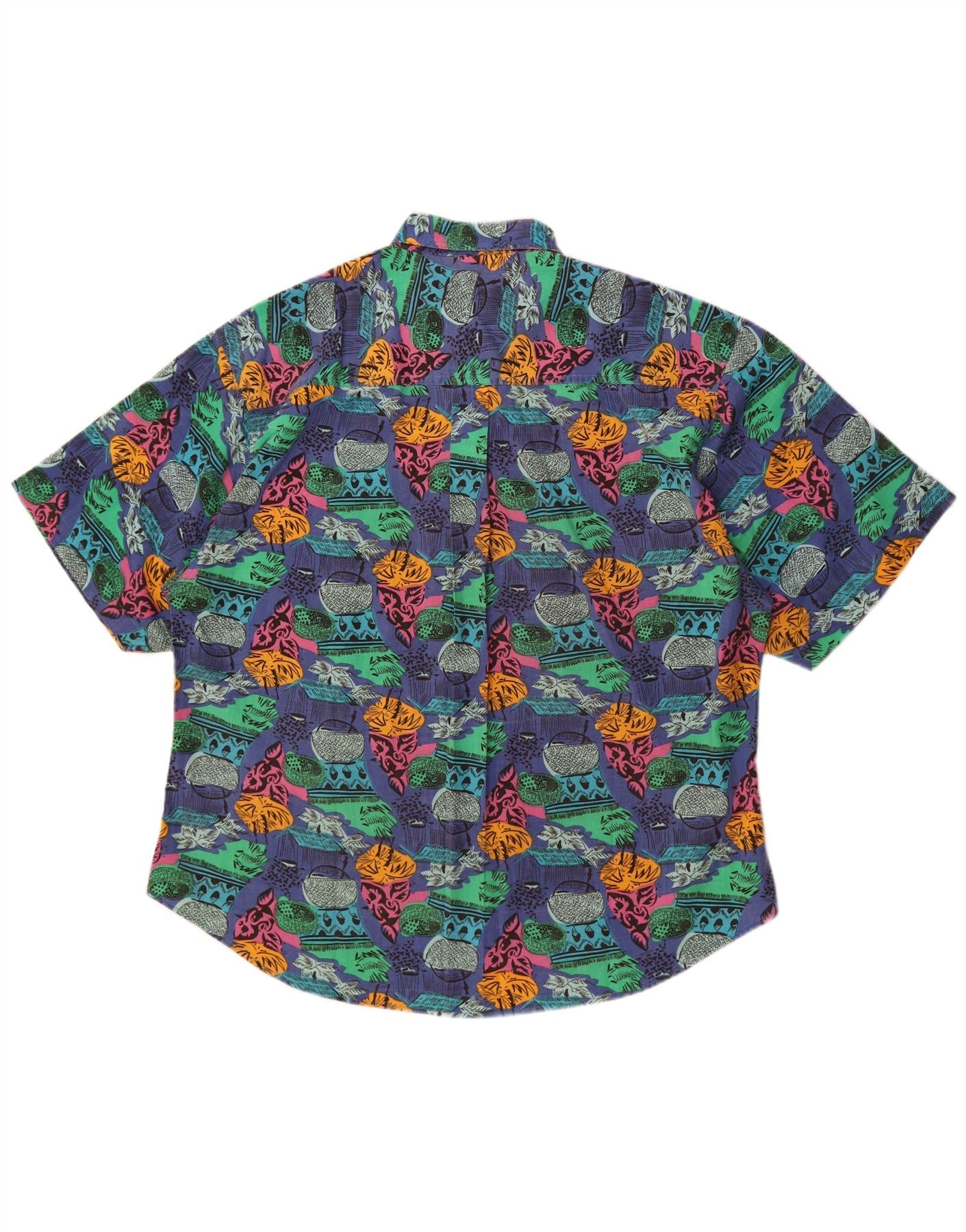 - Descrizione dell'IA: Questa camicia hawaiana da uomo vintage è realizzata in un tessuto leggero. Presenta un vivace motivo geometrico astratto nei toni del blu, verde e viola. Lo scollo con colletto e le maniche corte offrono un classico look tropicale. Le tasche frontali abbottonate e le tasche sul petto aggiungono dettagli funzionali. La sua vestibilità regolare assicura una vestibilità comoda, perfetta per uno stile rilassato.