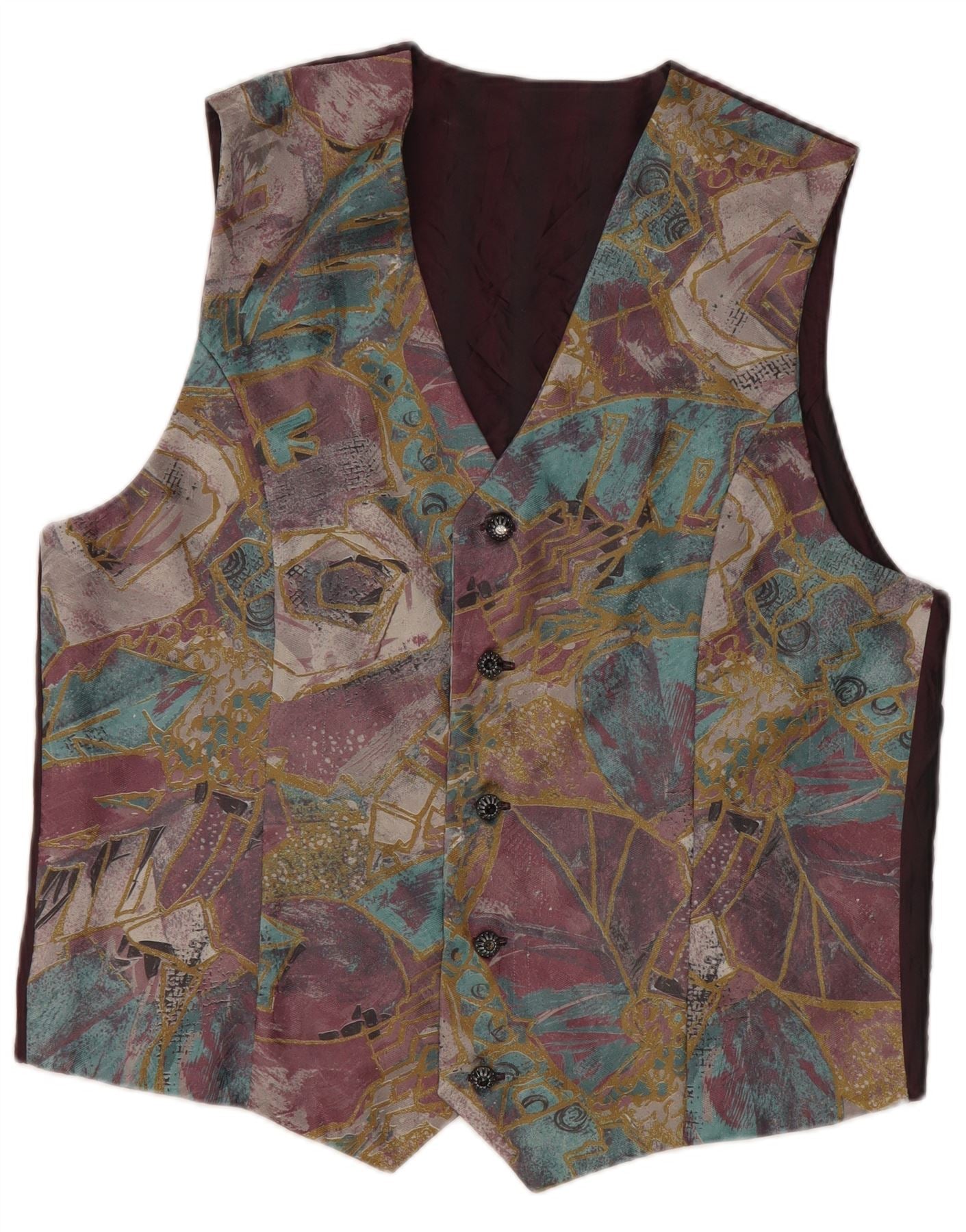 - Descrizione dell'IA: Questo gilet da uomo vintage presenta un tessuto intrecciato con una delicata lucentezza. Presenta un sorprendente motivo geometrico multicolore, che fonde toni bordeaux, turchesi e viola. Il design senza maniche e lo scollo a V offrono una silhouette classica. Una chiusura frontale a cinque bottoni garantisce una vestibilità ordinata. Questo gilet dalla vestibilità regolare è completamente foderato per comfort e struttura. Il suo stile retrò aggiunge un tocco distintivo.