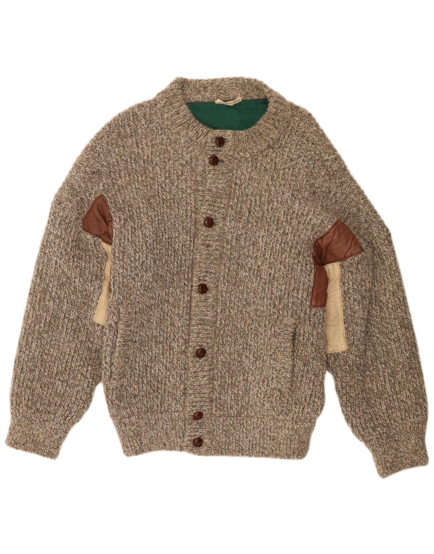 - Descrizione dell'IA: Questo maglione cardigan da uomo vintage è realizzato in calda maglia misto lana e alpaca, caratterizzato da una trama marrone screziata. Ha un classico scollo rotondo e un'abbottonatura completa sul davanti. Le maniche lunghe sono accentuate da toppe distintive sui gomiti. La vestibilità regolare garantisce comfort e facilità di indossabilità. Due tasche frontali aggiungono dettagli pratici. Questo pezzo offre uno stile accogliente e senza tempo.