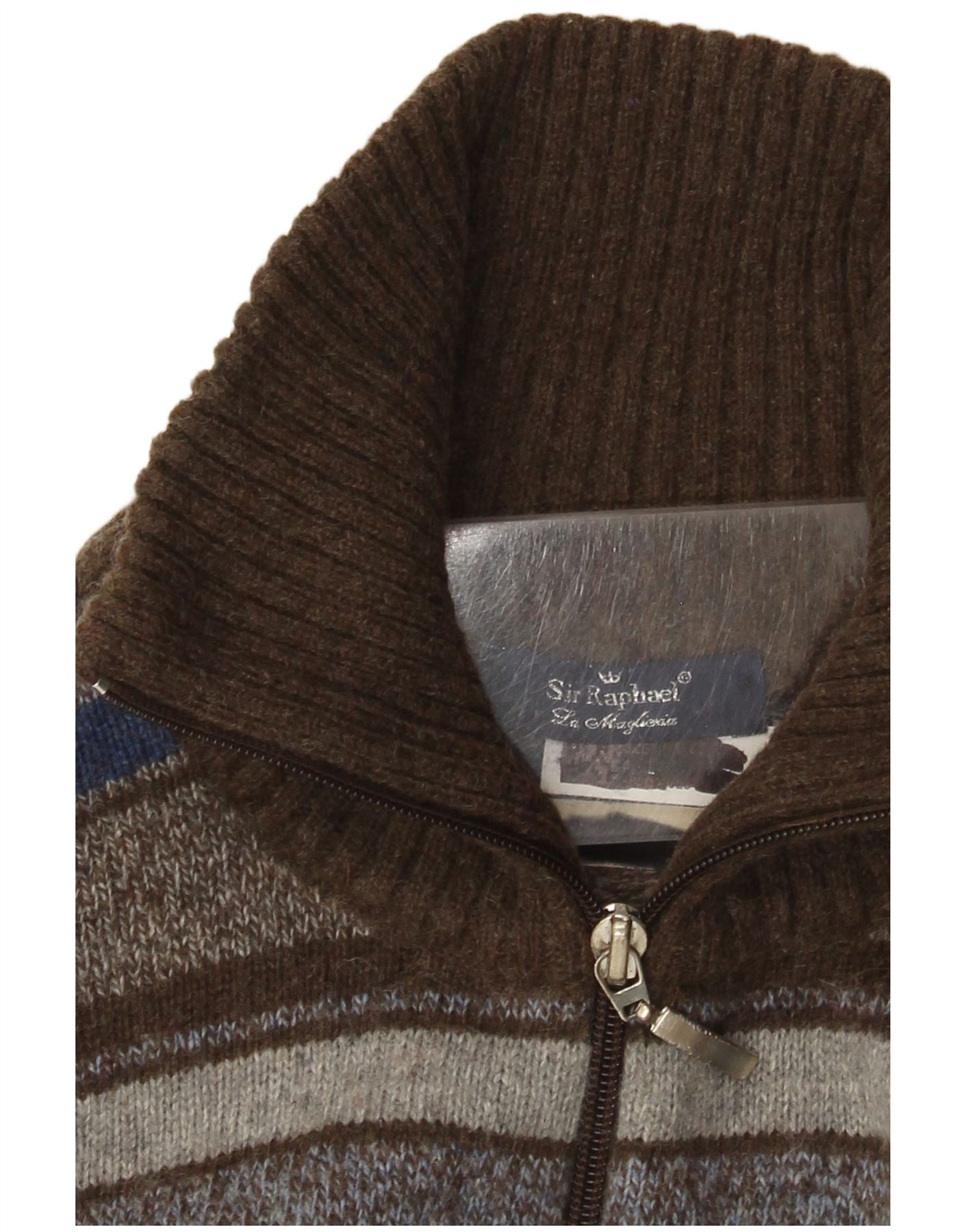 - Descrizione dell'IA: Questo maglione cardigan da uomo Sir Raphael è realizzato in morbido tessuto a maglia. Presenta un caratteristico motivo a strisce nei toni del marrone, grigio e blu. Il collo alto offre calore e una classica silhouette a collo alto. Una chiusura con zip completa corre lungo la parte anteriore, completando la vestibilità regolare. Finitura delle maniche lunghe con comodi orli con risvolto. Questo pezzo in stile retrò offre comfort e un'estetica senza tempo.
