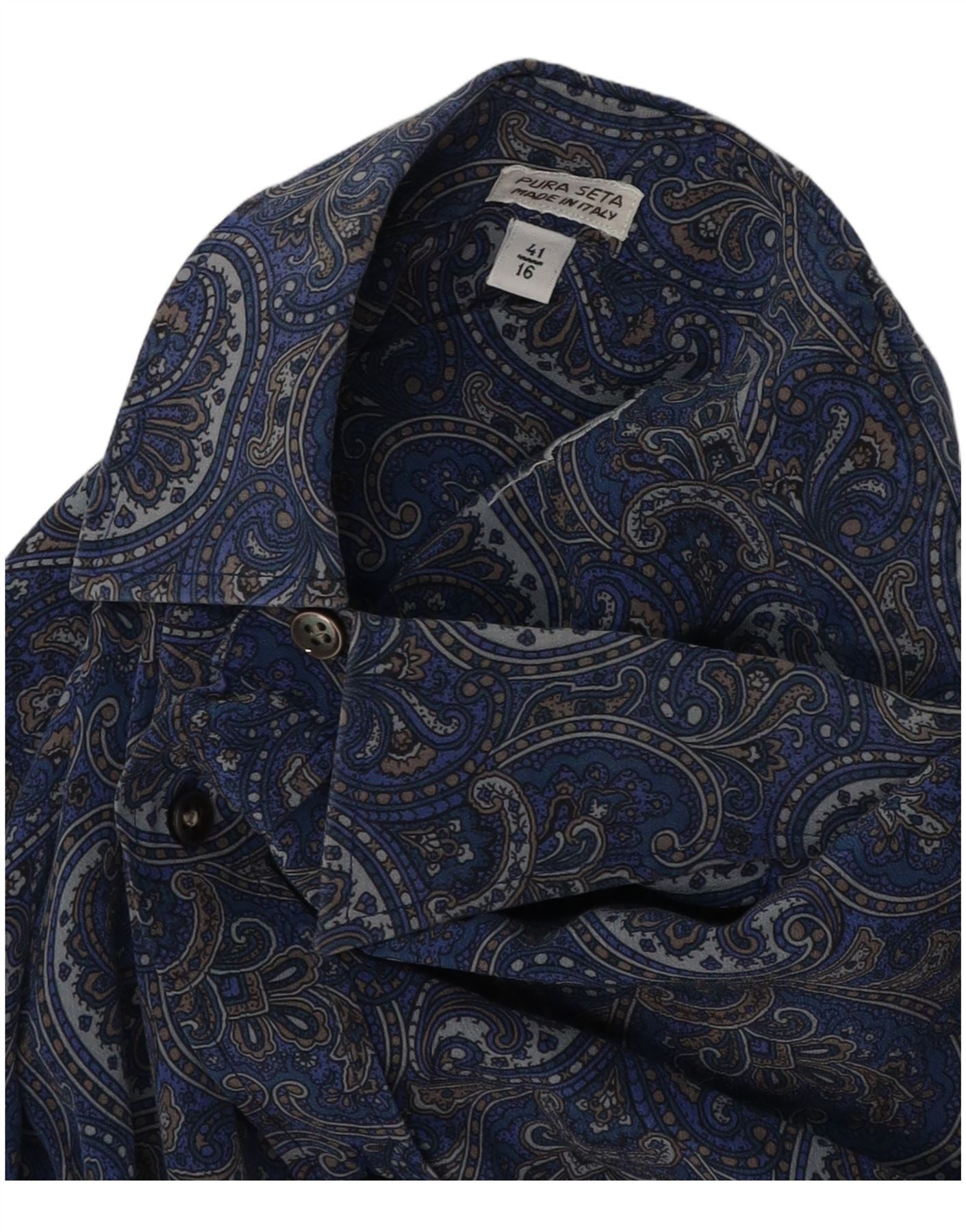 - Descrizione dell'IA: Questa camicia da uomo vintage è realizzata in lussuosa seta pura, offrendo una trama leggera e liscia. Presenta una ricca base blu ornata da un intricato motivo paisley. Lo scollo con colletto e la chiusura con bottoni forniscono una struttura classica. Finitura delle maniche lunghe con polsini ordinati. Progettata per una vestibilità regolare, questa camicia in stile retrò unisce comfort e sofisticato interesse visivo.