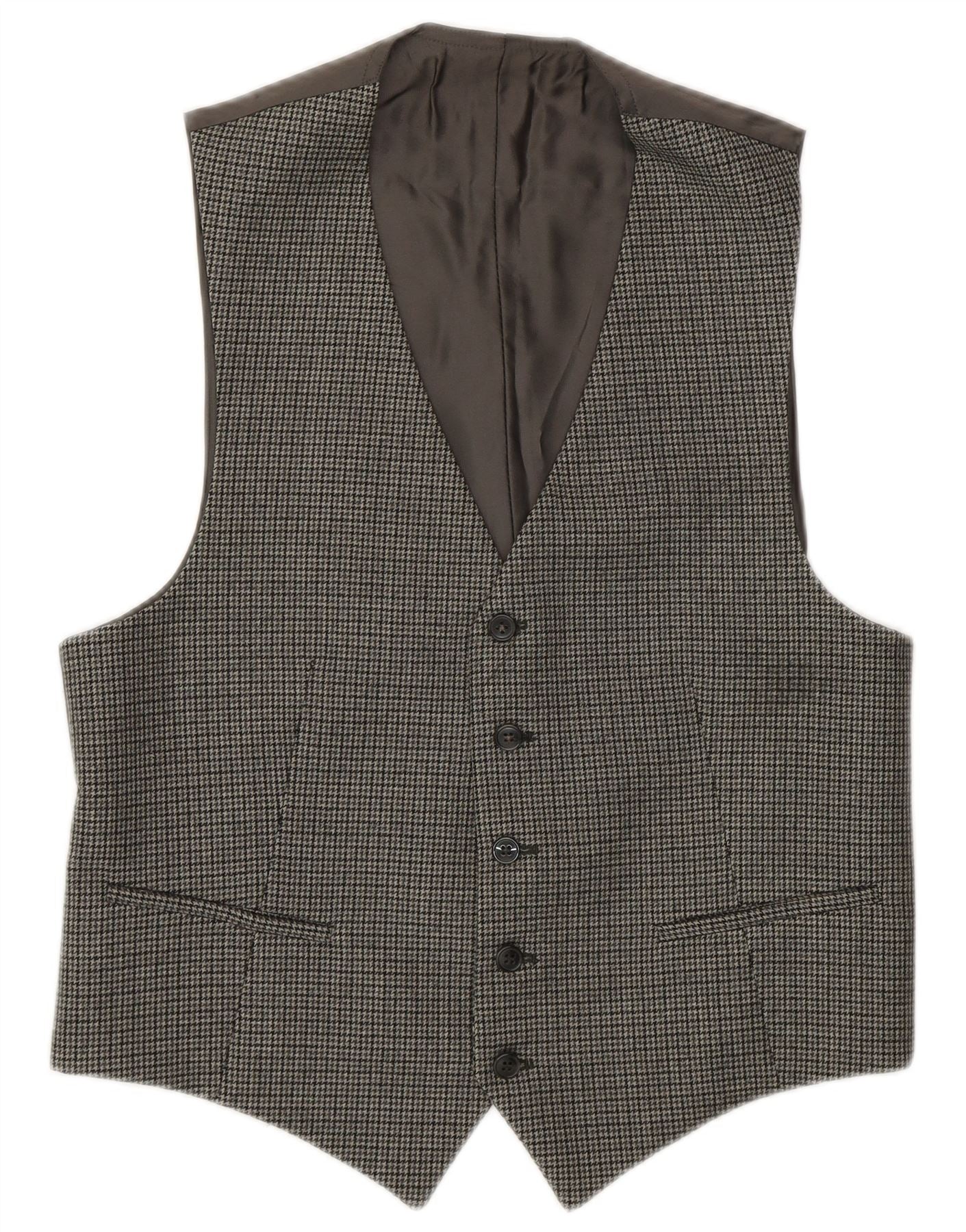 - Descrizione dell'IA: Questo gilet da uomo vintage è realizzato in tessuto grigio, caratterizzato da un classico motivo pied de poule. Lo scollo a V e il design senza maniche offrono una silhouette tradizionale. Una chiusura frontale a cinque bottoni fornisce una finitura pulita. Presenta pratiche tasche e vanta una vestibilità regolare per un abbigliamento comodo. Questo capo incarna uno stile senza tempo e una sartorialità raffinata.
