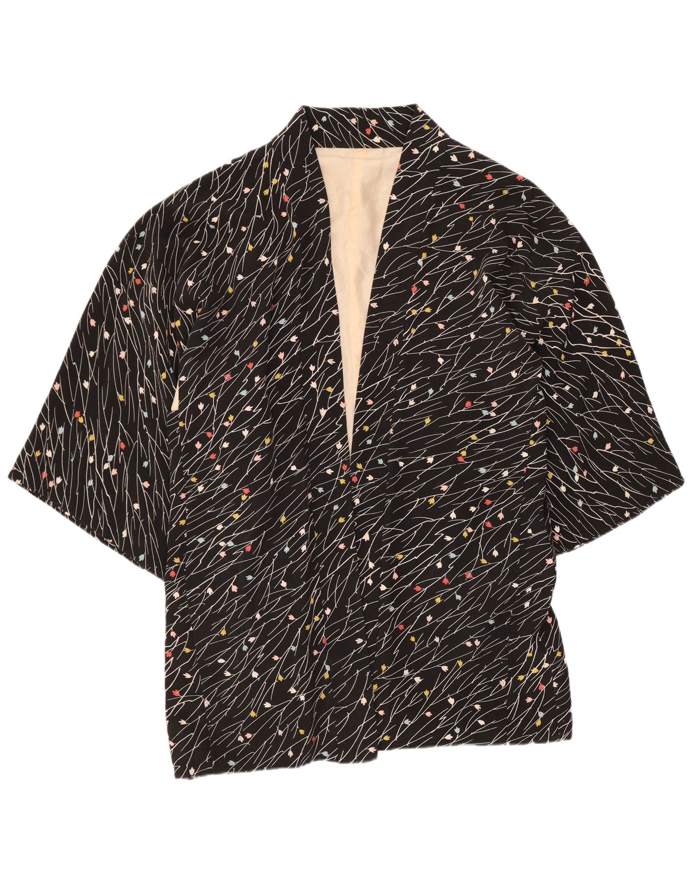 - Descrizione dell'IA: Questa giacca kimono da donna vintage è realizzata in tessuto nero con finitura liscia. Presenta un intricato motivo astratto di delicate linee bianche e piccoli punti colorati. Lo scollo con colletto e l'apertura sul davanti creano una silhouette rilassata. Le maniche a 3/4 offrono una vestibilità comoda e ampia. Questa giacca foderata cade elegantemente.