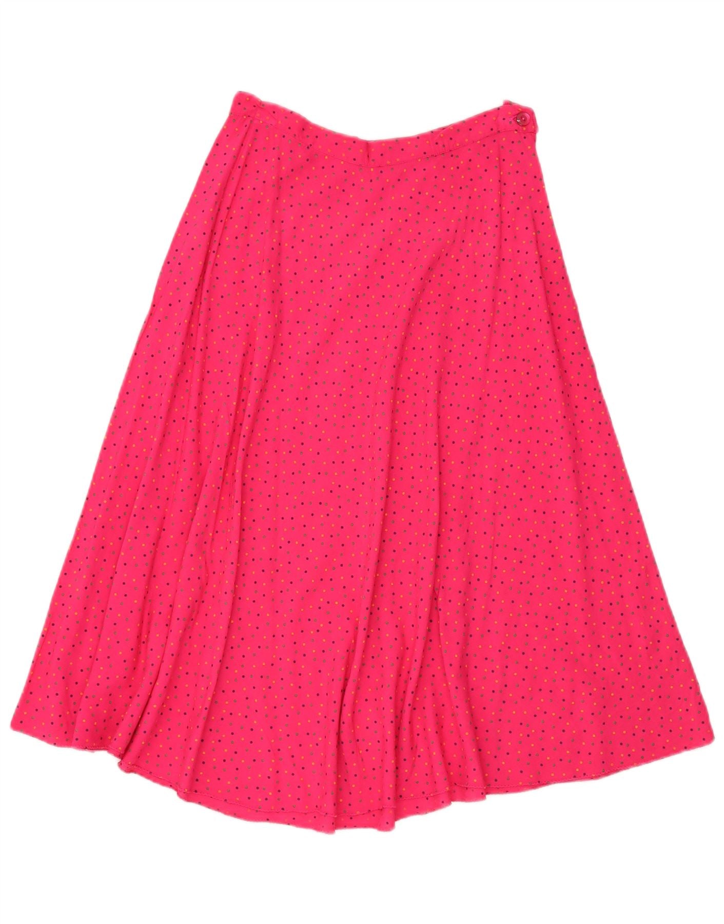 - Descrizione dell'IA: Questa gonna a trapezio da donna vintage è realizzata in tessuto leggero di rayon e offre un morbido drappeggio. Presenta una vivace base rosa ornata da un classico motivo a pois. La lunghezza midi e il taglio a trapezio creano una silhouette aggraziata e fluida. Una discreta chiusura con zip garantisce una vestibilità comoda, completata da un discreto bottone. La vestibilità regolare e lo stile retrò lo rendono un capo versatile e affascinante.