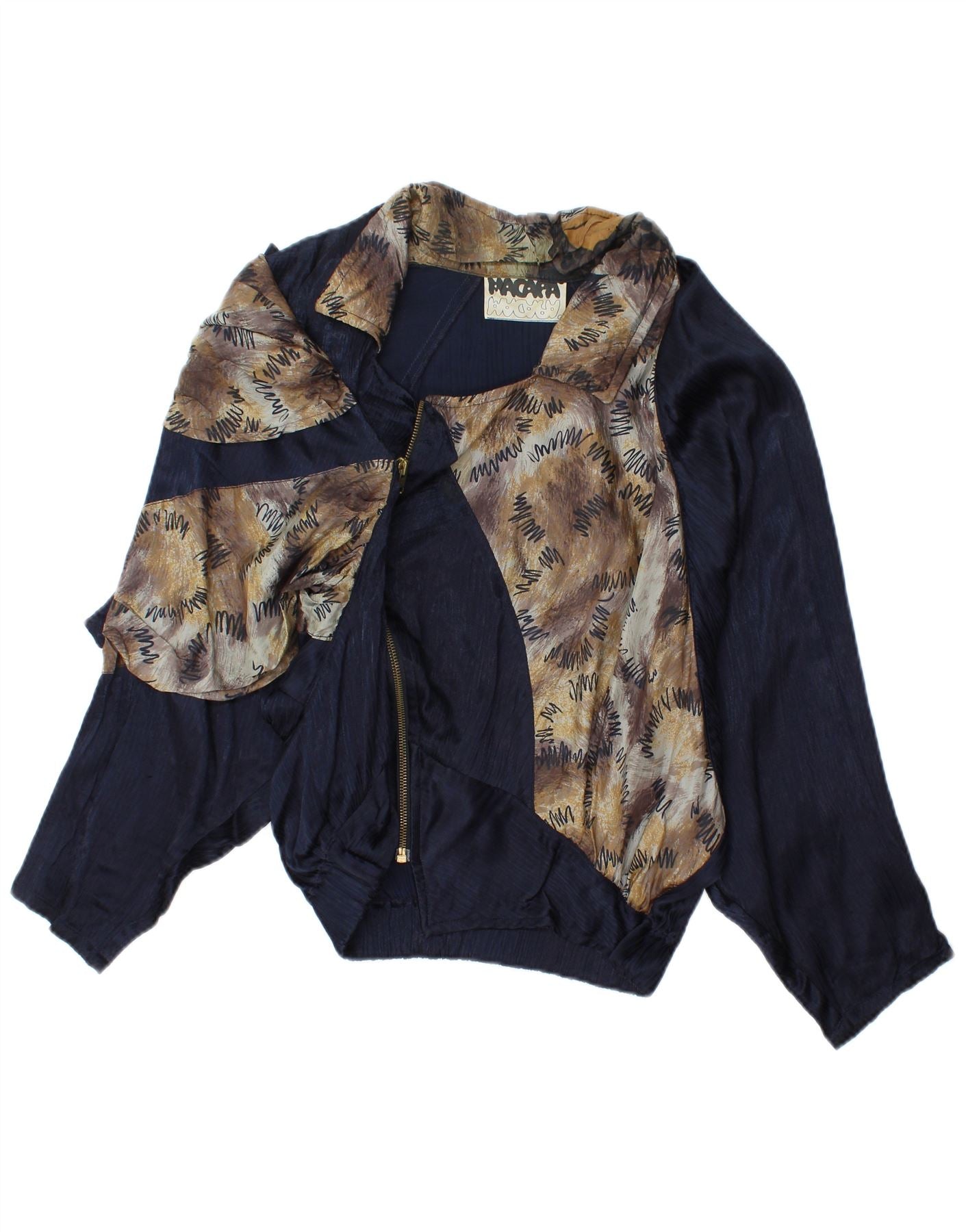 - Descrizione dell'IA: Questo bomber da donna Vintage Magara è realizzato in un lussuoso misto viscosa e seta. Offre un drappeggio fluido e leggero con una finitura testurizzata sottile sulle sezioni blu scuro. La giacca presenta uno scollo con colletto e una chiusura centrale con zip. Le maniche lunghe e la vita elasticizzata definiscono la sua vestibilità ampia e rilassata. Audaci pannelli con stampa animalier adornano la parte anteriore creando un sorprendente contrasto visivo. L'accento sulla zip aggiunge un dettaglio funzionale ma elegante.