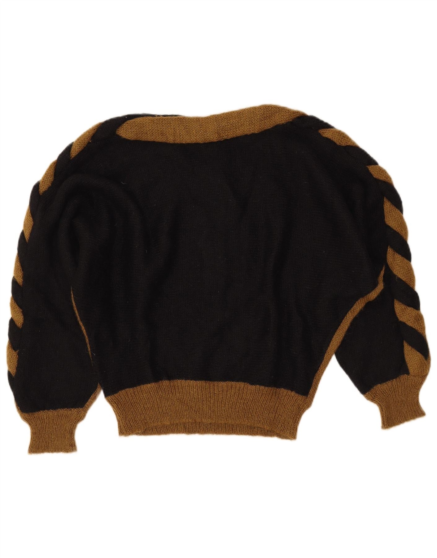 - Descrizione dell'IA: Questo maglione da donna vintage è realizzato in morbida maglia di mohair, che offre una trama lussuosa. Presenta un sorprendente motivo a strisce in marrone e nero. Il design con scollo a barca offre una silhouette rilassata. Le maniche lunghe e lo stile pullover garantiscono comfort e facilità da indossare. Questo pezzo di ispirazione retrò combina calore con un fascino visivo distintivo.
