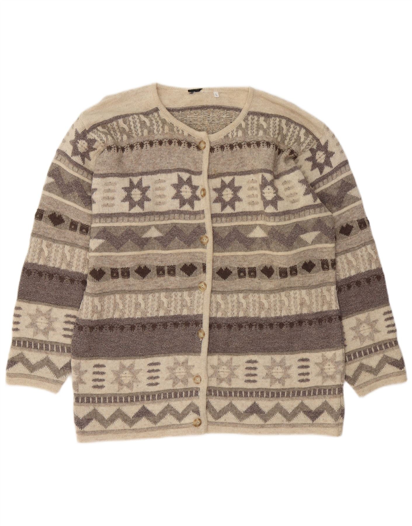 Maglione cardigan da donna vintage UK 16 Large Beige Fair Isle
