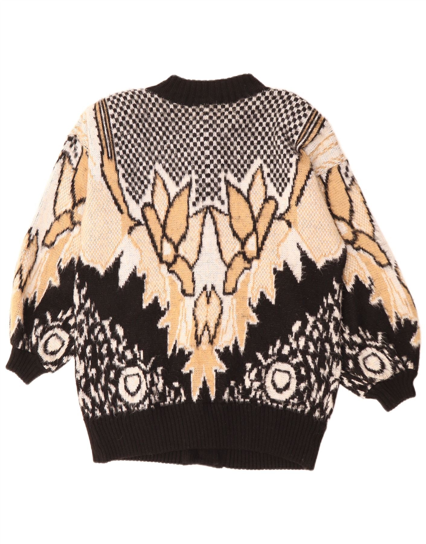 - Descrizione dell'IA: Questo maglione cardigan da donna vintage è realizzato in maglia di lana al 100%, offrendo una consistenza morbida e calda. Presenta un sorprendente motivo geometrico e astratto multicolore in nero, beige e bianco sporco. Il girocollo e le maniche a 3/4 ne definiscono la vestibilità rilassata. Una chiusura con bottoni corre lungo la parte anteriore. I pulsanti fungono da accento elegante, completando il design retrò.
