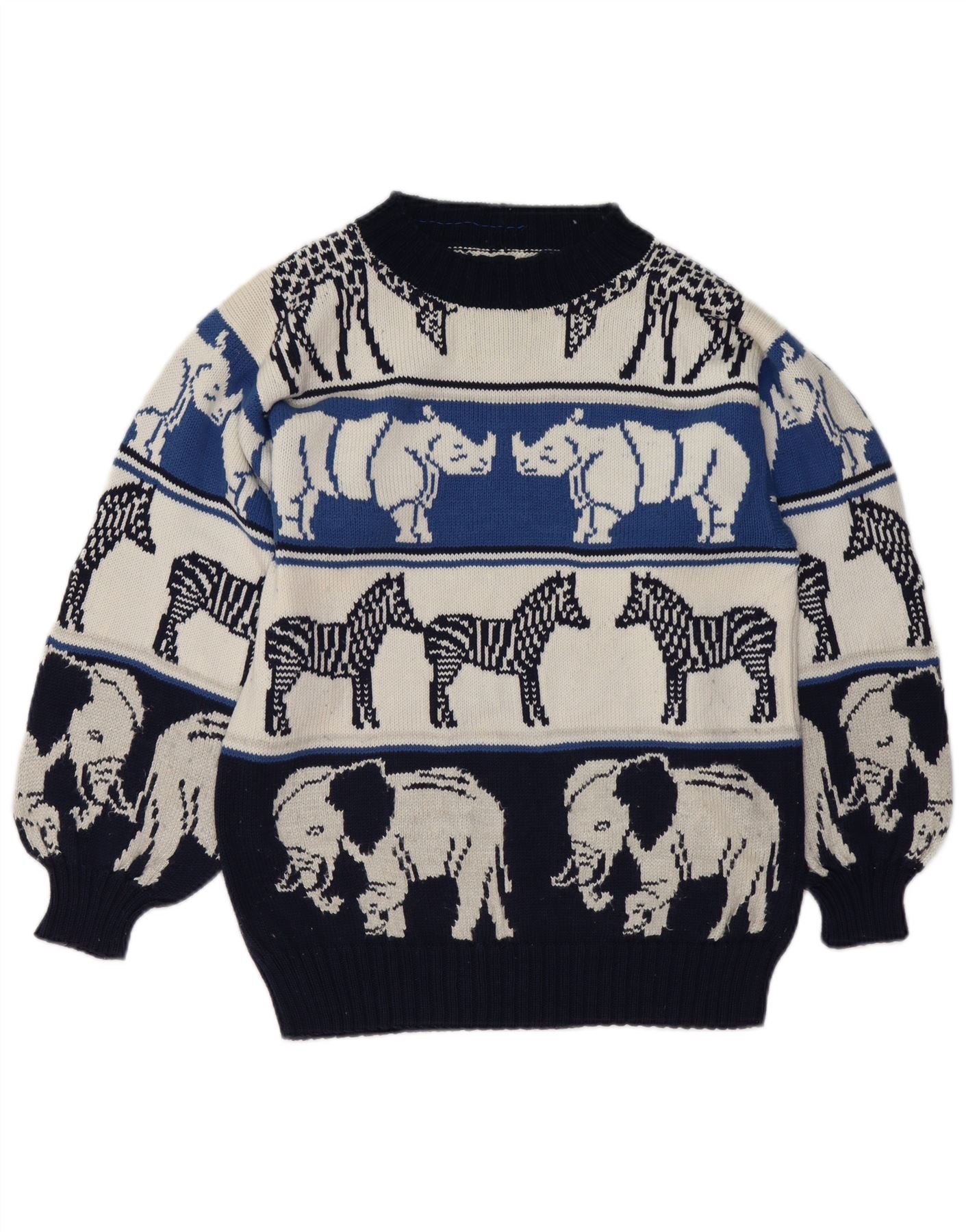 Maglione maglione girocollo da donna VINTAGE UK 18 XL blu navy stampa animalier