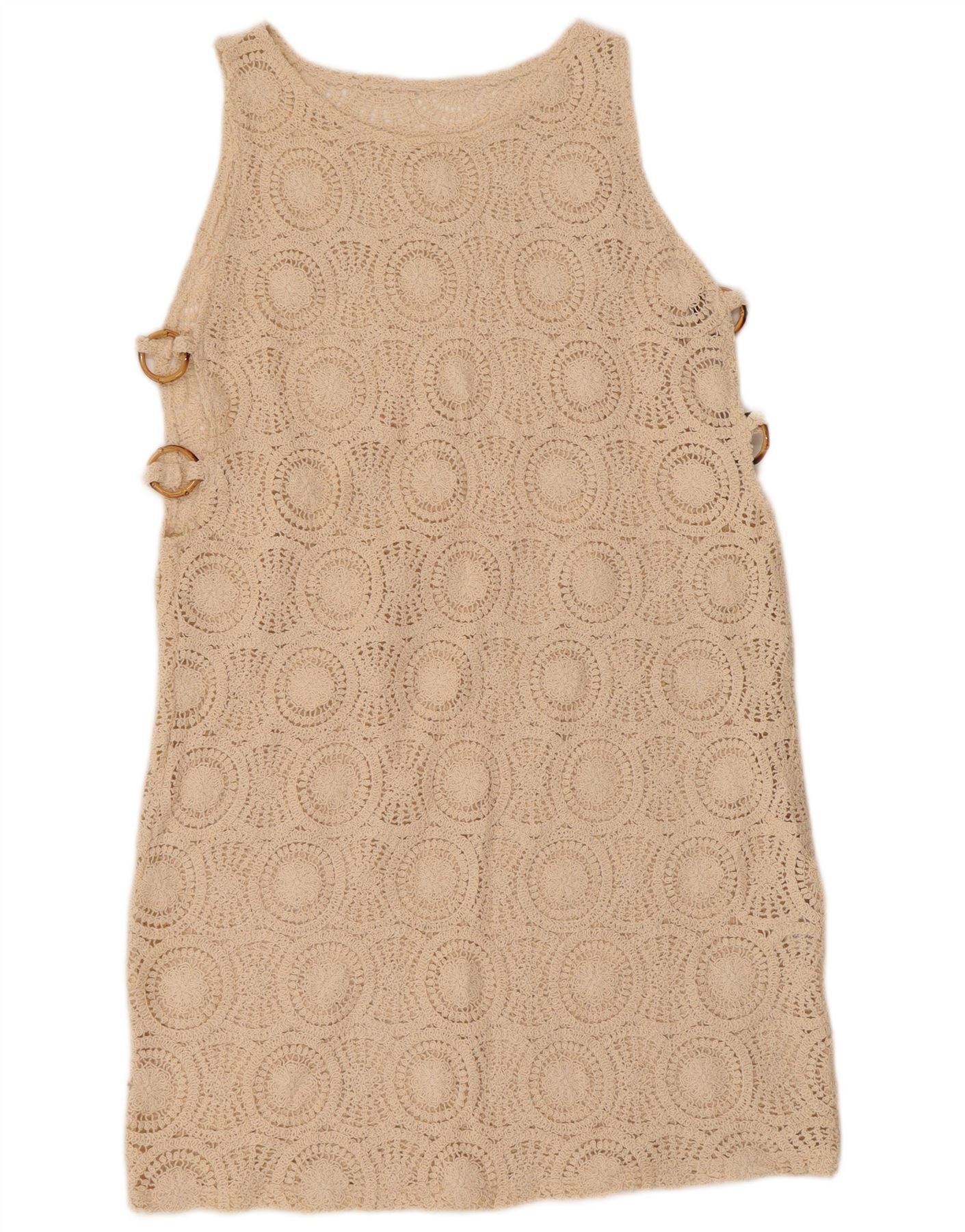 Abito a trapezio senza maniche all'uncinetto da donna VINTAGE UK 10 piccolo cotone beige