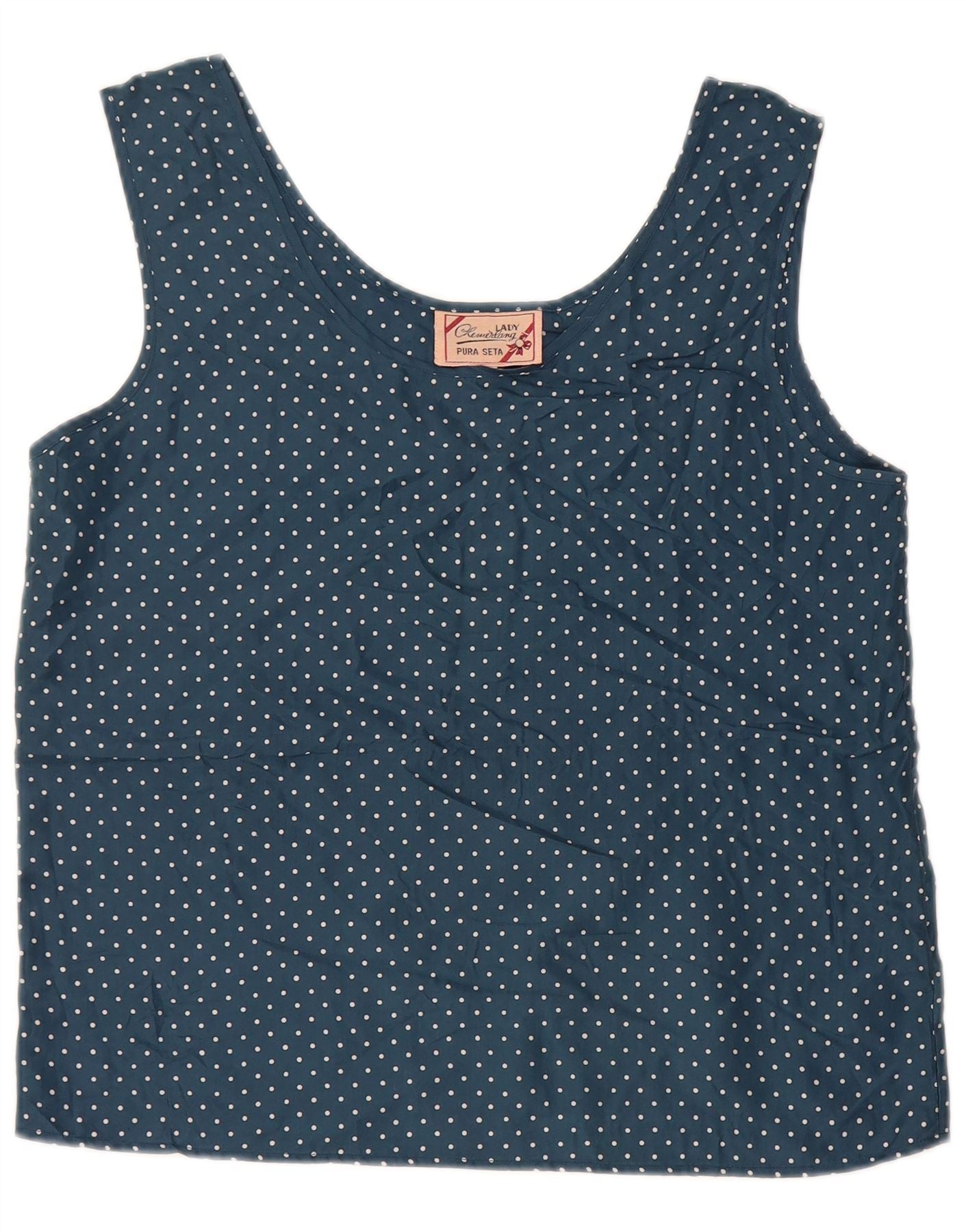 Top camicetta senza maniche corta da donna VINTAGE UK 14 grande blu navy maculato