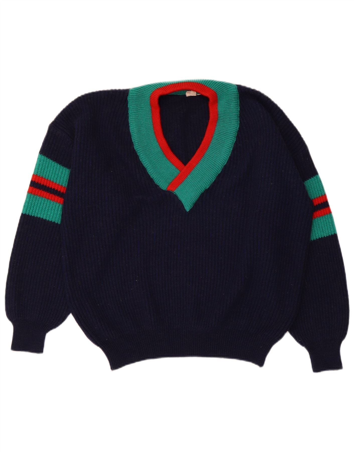Maglione da donna VINTAGE corto con scollo a V IT 48/50 XL a righe blu navy
