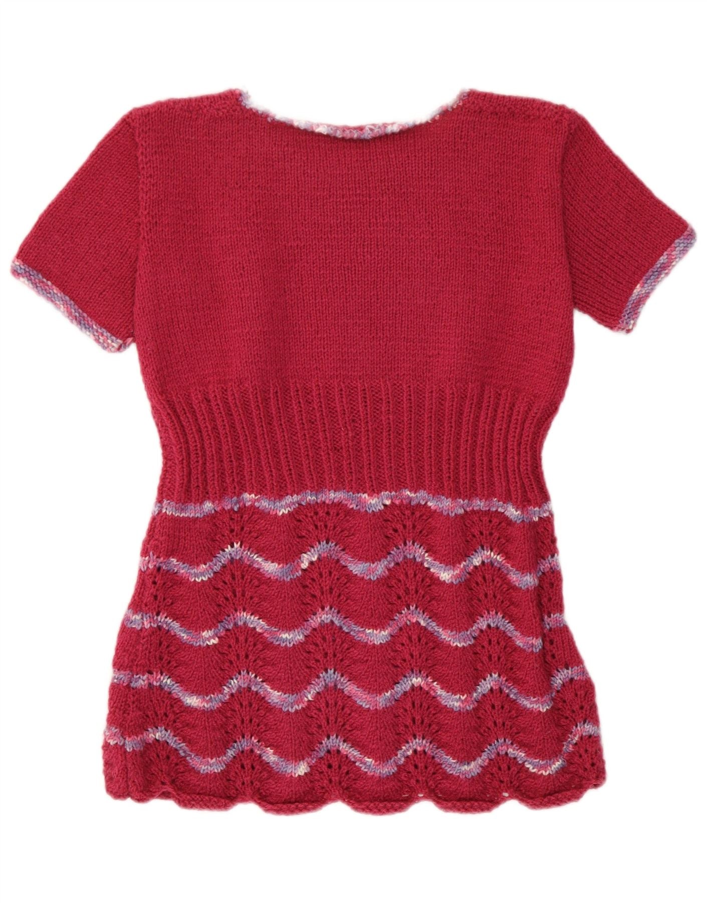 - Descrizione dell'IA: Questo maglione da donna vintage è realizzato in un pregiato tessuto a maglia bordeaux. Presenta un classico girocollo e maniche corte. La vestibilità regolare offre una vestibilità comoda. Una vita a coste definisce la silhouette. Un motivo astratto chevron in toni contrastanti adorna la parte inferiore. L'orlo è rifinito con un delicato bordo smerlato. Questo modello di maglione combina uno stile retrò con dettagli intricati.