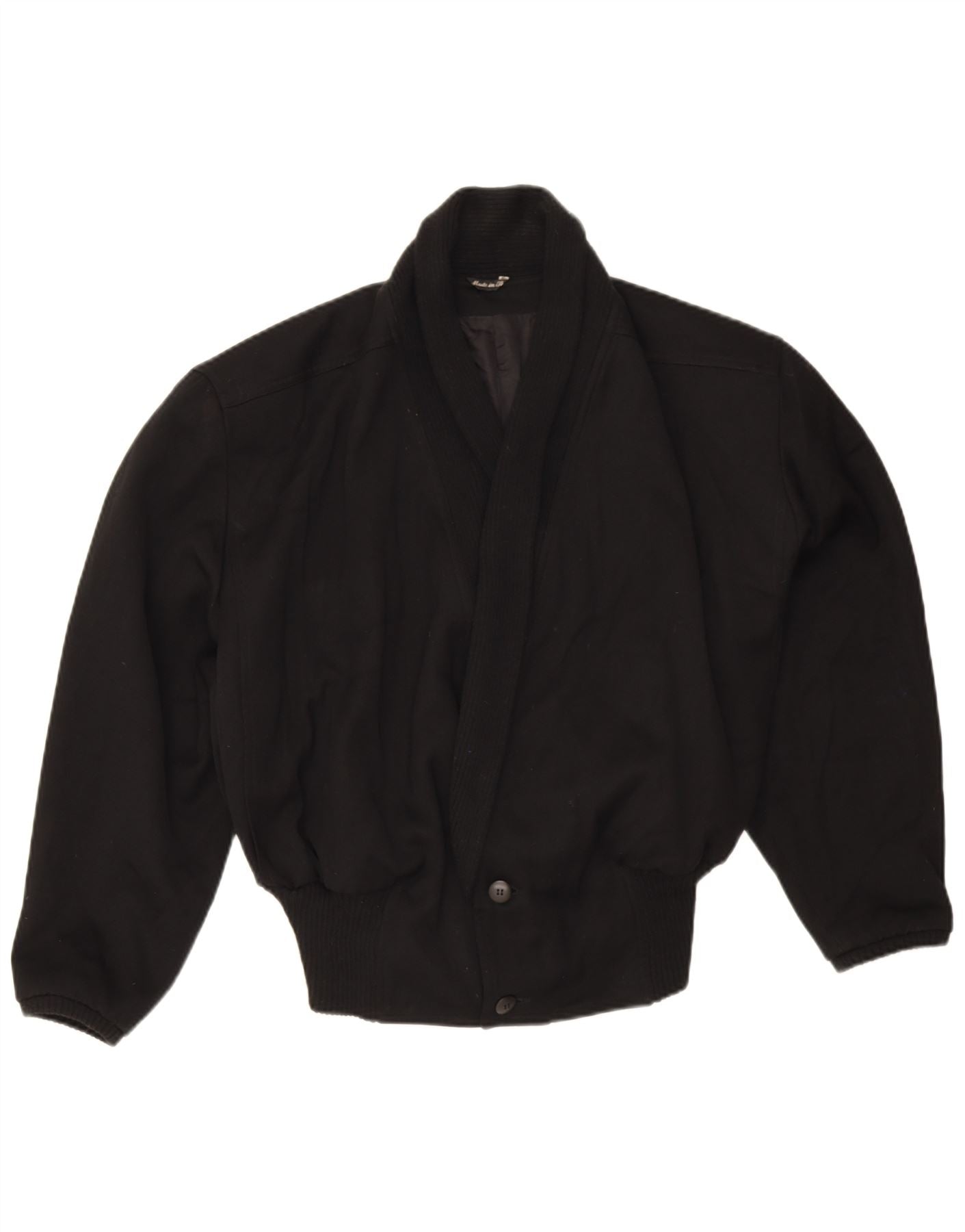 - Descrizione dell'IA: Questo bomber da donna vintage è realizzato in tessuto nero, offrendo una trama classica. Presenta uno scollo con colletto e un'abbottonatura frontale per una finitura ordinata. Le maniche lunghe terminano con polsini a coste, in tinta con l'orlo a coste. La vestibilità regolare offre una vestibilità comoda. Questa giacca foderata offre una silhouette senza tempo e versatile, perfetta per la stratificazione.