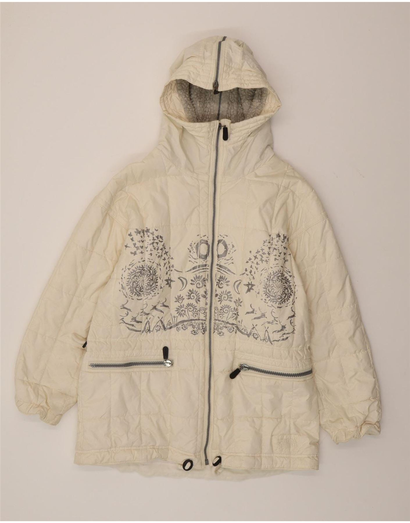 Cappotto imbottito oversize da donna vintage UK 10 piccolo poliestere Paisley bianco