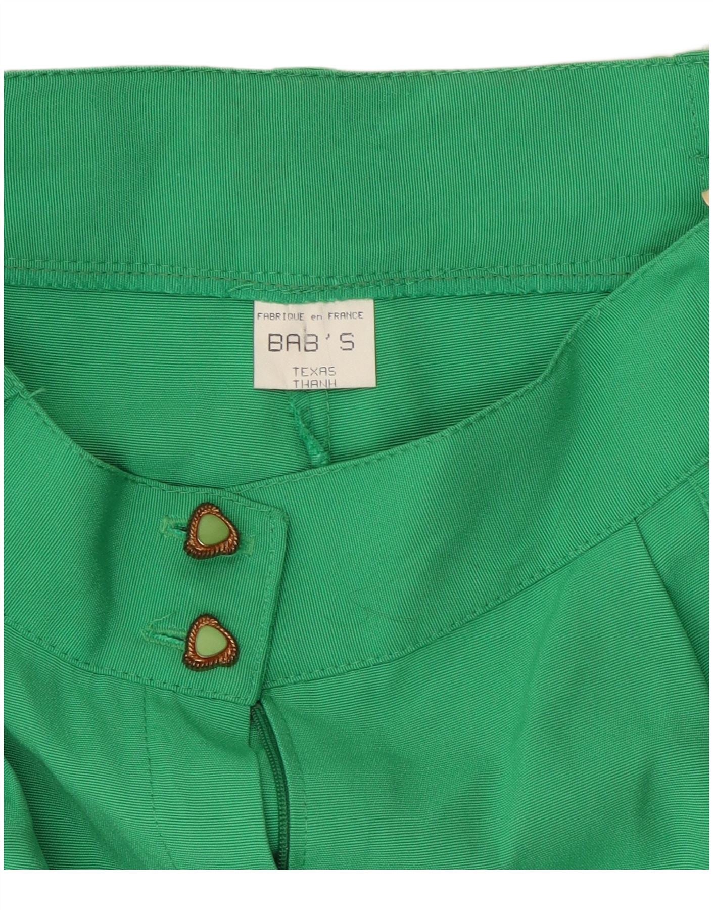 - Descrizione dell'IA: Questi pantaloncini vintage da donna sono realizzati in una vivace miscela di viscosa e poliammide di colore verde, che offre una trama liscia e intrecciata. Presentano un design a vita alta con una vestibilità classica e regolare. La parte anteriore è fissata con chiusure a bottone distintive. Pratiche tasche sono incluse per comodità. Il design è pulito e senza motivi, concentrandosi sul colore intenso e sulla silhouette su misura. L'orlo è ben risvolto, aggiungendo un tocco raffinato.