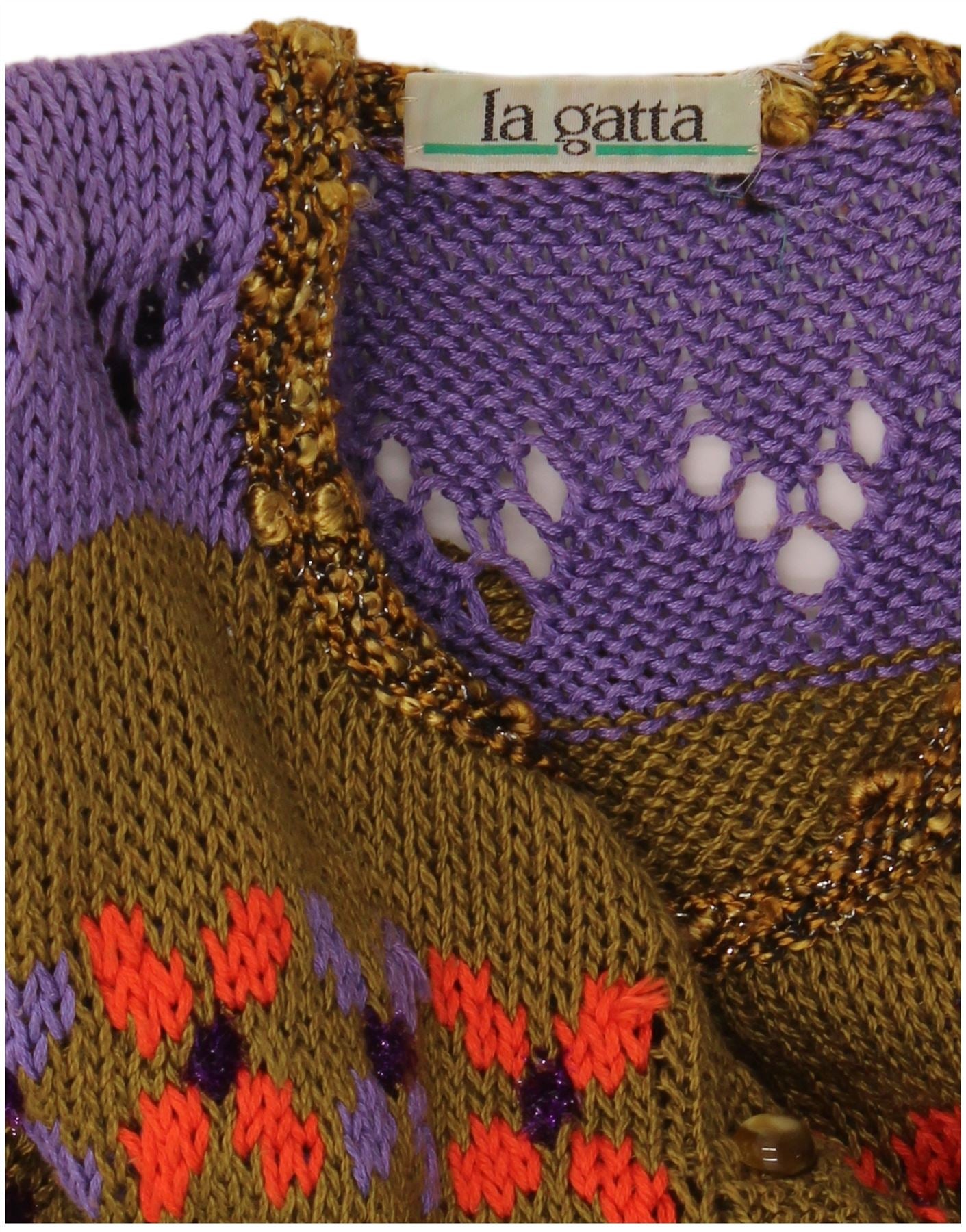 - Descrizione dell'IA: Questo maglione cardigan da donna vintage è realizzato in un vivace tessuto a maglia con sottili accenti glitterati. Presenta un pazzesco motivo floreale nei toni del verde, viola e arancione. Il girocollo e l'abbottonatura frontale offrono uno stile classico. Le maniche corte a sbuffo aggiungono un tocco retrò. La sua vestibilità regolare garantisce una vestibilità comoda, rendendolo un pezzo unico.