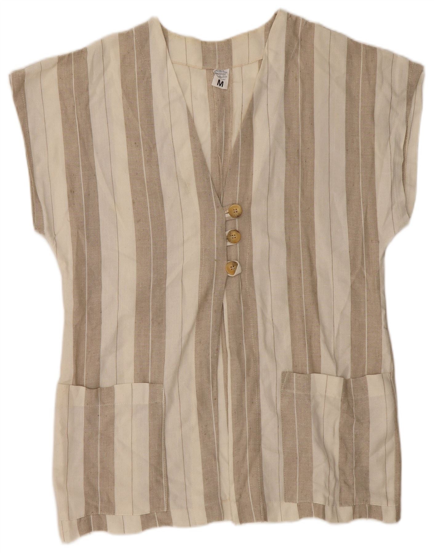 Camicetta camicia a maniche corte da donna vintage UK 14 Lino a righe beige medio