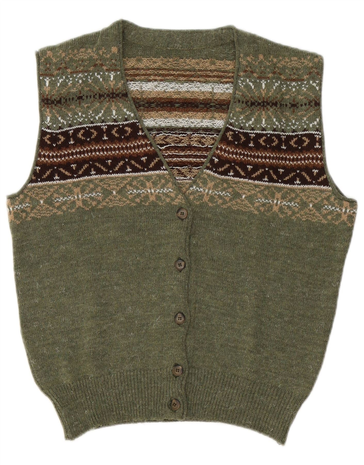 Maglione cardigan senza maniche da donna VINTAGE UK 14 Verde medio Fair Isle