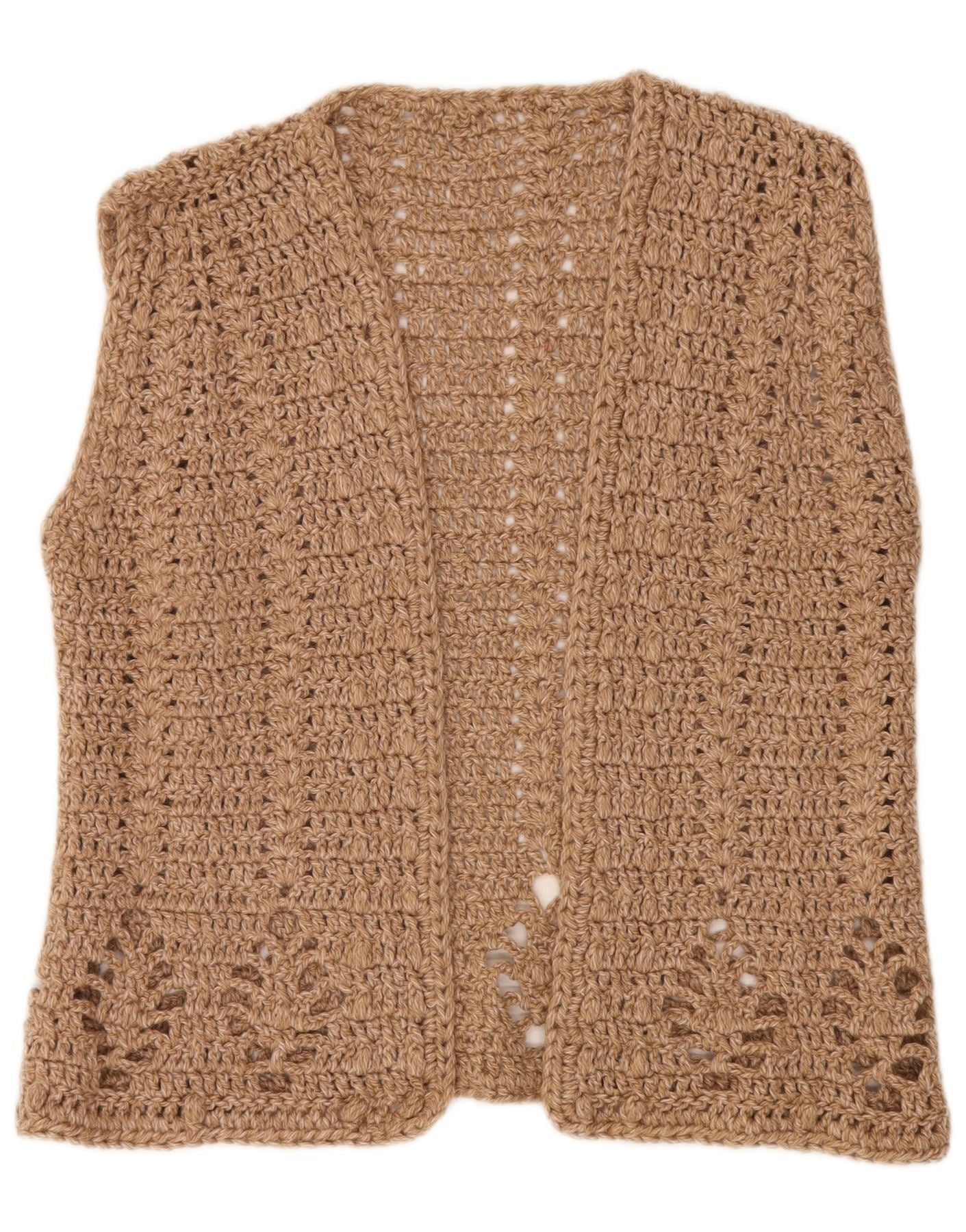 Maglione cardigan all'uncinetto senza maniche da donna VINTAGE UK 14 Large Beige