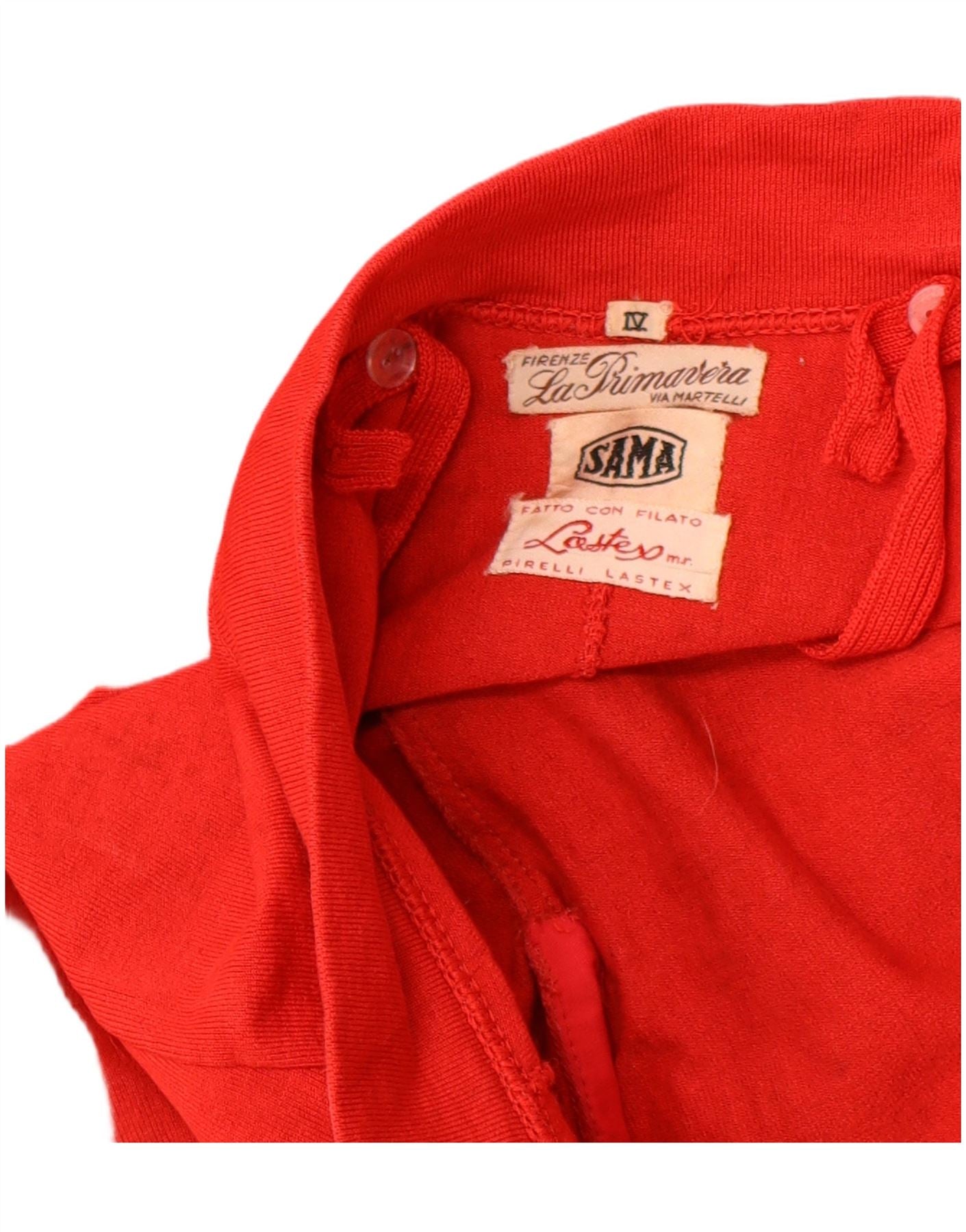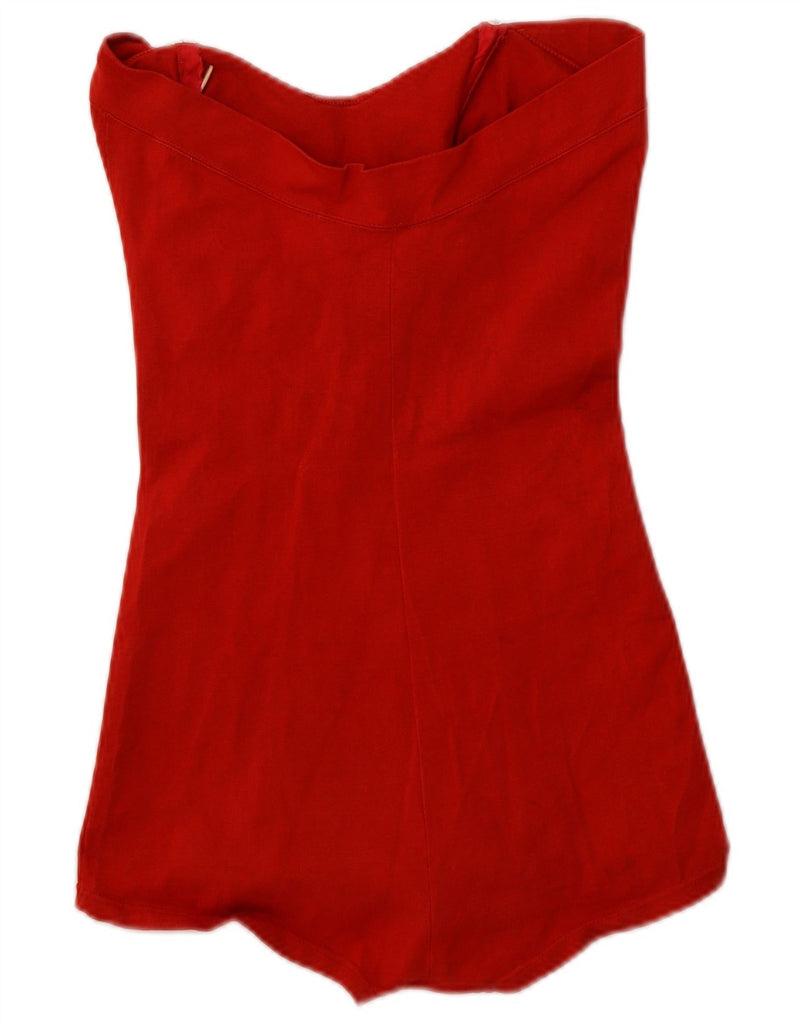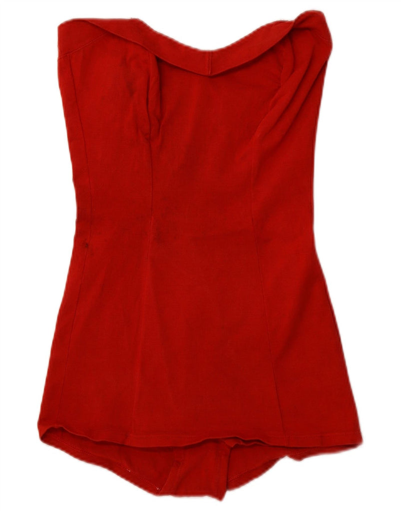 - AI Description: This Vintage women's swimwear is crafted from a red elastomere knit, featuring Lastex Yarn Pirelli Latex for exceptional stretch. The strapless design offers a sleek, slim fit. It is sleeveless, creating a clean silhouette. A subtle button closure adds a retro touch. This piece combines comfort with a classic, streamlined aesthetic, perfect for swimming.