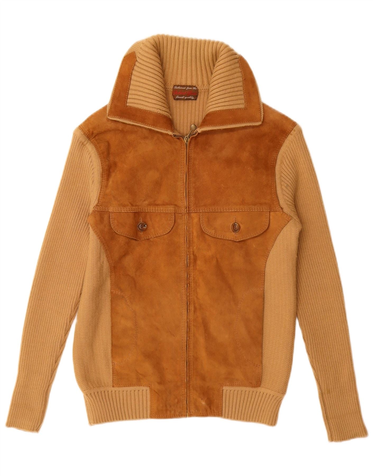 Maglione cardigan in pelle scamosciata da donna VINTAGE UK 12 Colorblock beige medio