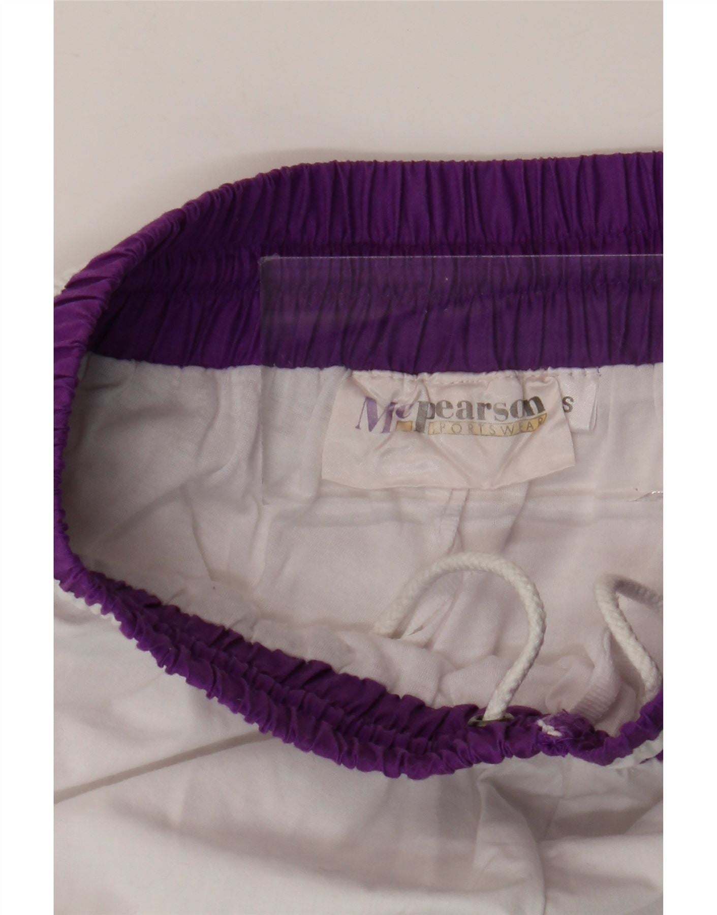 - Descrizione dell'IA: Questi pantaloni vintage da donna Windbreaker sono realizzati in un tessuto leggero in un bianco frizzante. Presentano una vestibilità comoda e ampia con vita elasticizzata con coulisse per il massimo comfort. Le gambe sono ammanettate alla caviglia. Un vivace motivo geometrico astratto in viola, verde acqua, arancione e nero corre lungo i pannelli laterali. Sono incluse pratiche tasche. Un sottile logo McPearson Sportswear aggiunge un tocco di marca.