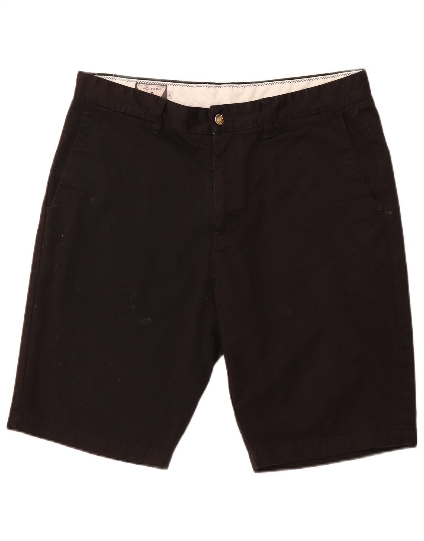 - AI Description: This Volcom mens Chino Shorts are presented in a versatile black, crafted from a comfortable cotton polyester blend fabric. The regular fit ensures a classic silhouette and ease of movement. They feature a secure button closure for a neat finish. Practical pockets add functionality, while the blended fabric provides stretch and comfort for everyday wear.